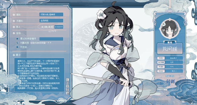 拜入师门后一心修炼剑术,小有所成后偶尔女扮男装下山打抱不平,行侠仗义。是个不惹事就闲不住的性格。