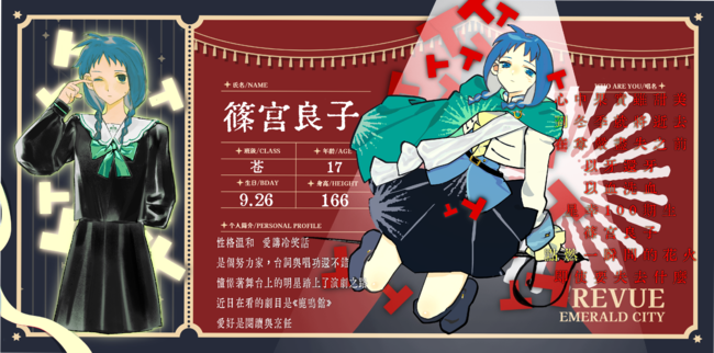 17岁 苍组 性格溫和 愛講冷笑話 是個努力家,台詞與唱功還不錯 憧憬著舞台上的明星踏上了演劇之路 近日在看的劇目是《鹿鳴館》 愛好是閱讀與烹飪