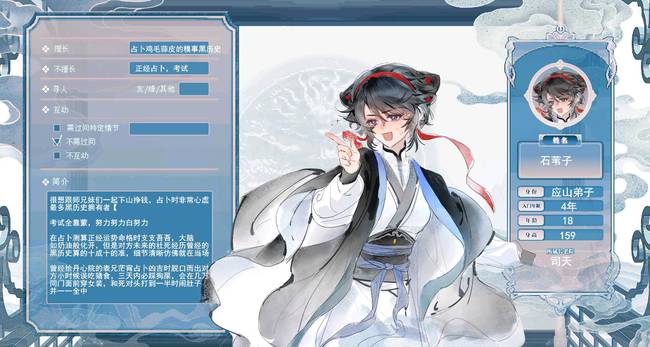 很想跟师兄妹们一起下山挣钱,占卜时非常心虚 最多黑历史拥有者【 考试全靠蒙,努力努力白努力 在占卜测算正经运势命格时支支吾吾,大脑如奶油般化开,但是对方未来的社死经历曾经的黑历史算的十成十的准,细节清晰仿佛就在当场 曾经给丹心院的表兄茫宵占卜凶吉时脱口而出对方小时候误吃猪食,三天内必踩狗屎,会在几万同门面前穿女装,和死对头打到一半时闹肚子并一一全中后一战成名