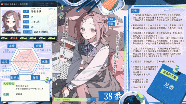 仔细一看是子女比较多的家庭呢,不是长子也不是次子,想必成长过程中会有很多受到冷落的时候吧。所以,首先,恭喜千世同学这次抽中了福签。不论你接下来的结果会如何,薄根千世这个名字肯定会在家中留下不可磨灭的存在感吧。祝愿有一个这样的好梦