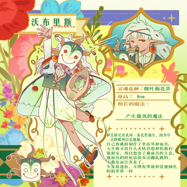 自己用桃核制作了里拉琴和面具,天生做不出什么表情但想和妖精们做朋友,所以想出了戴面具的主意。