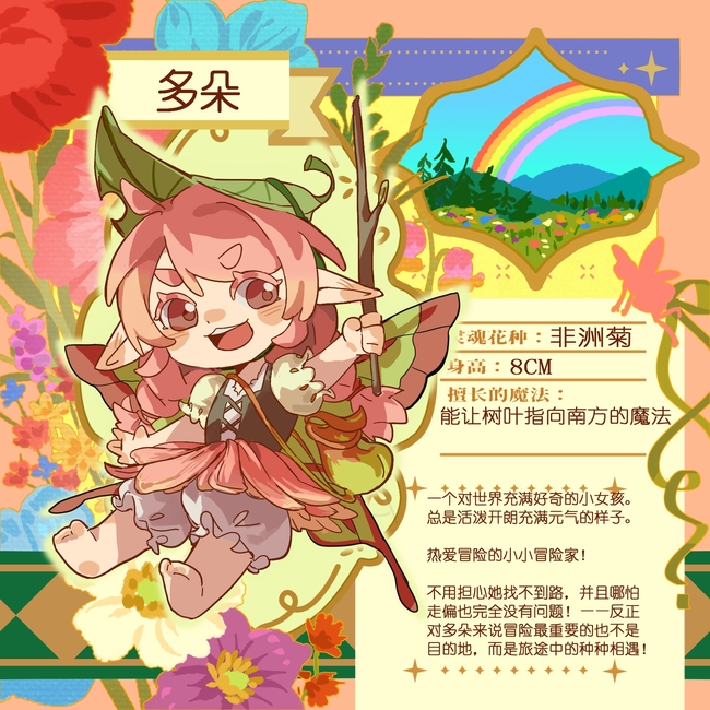 一个对世界充满好奇的小女孩。 总是活泼开朗充满元气的样子。 热爱冒险的小小冒险家! 不用担心她找不到路,反正哪怕走偏也完全没有问题!——反正对多朵来说冒险最重要的也不是目的地,而是旅途中的种种相遇!