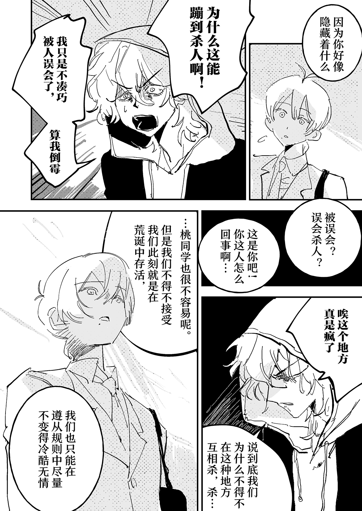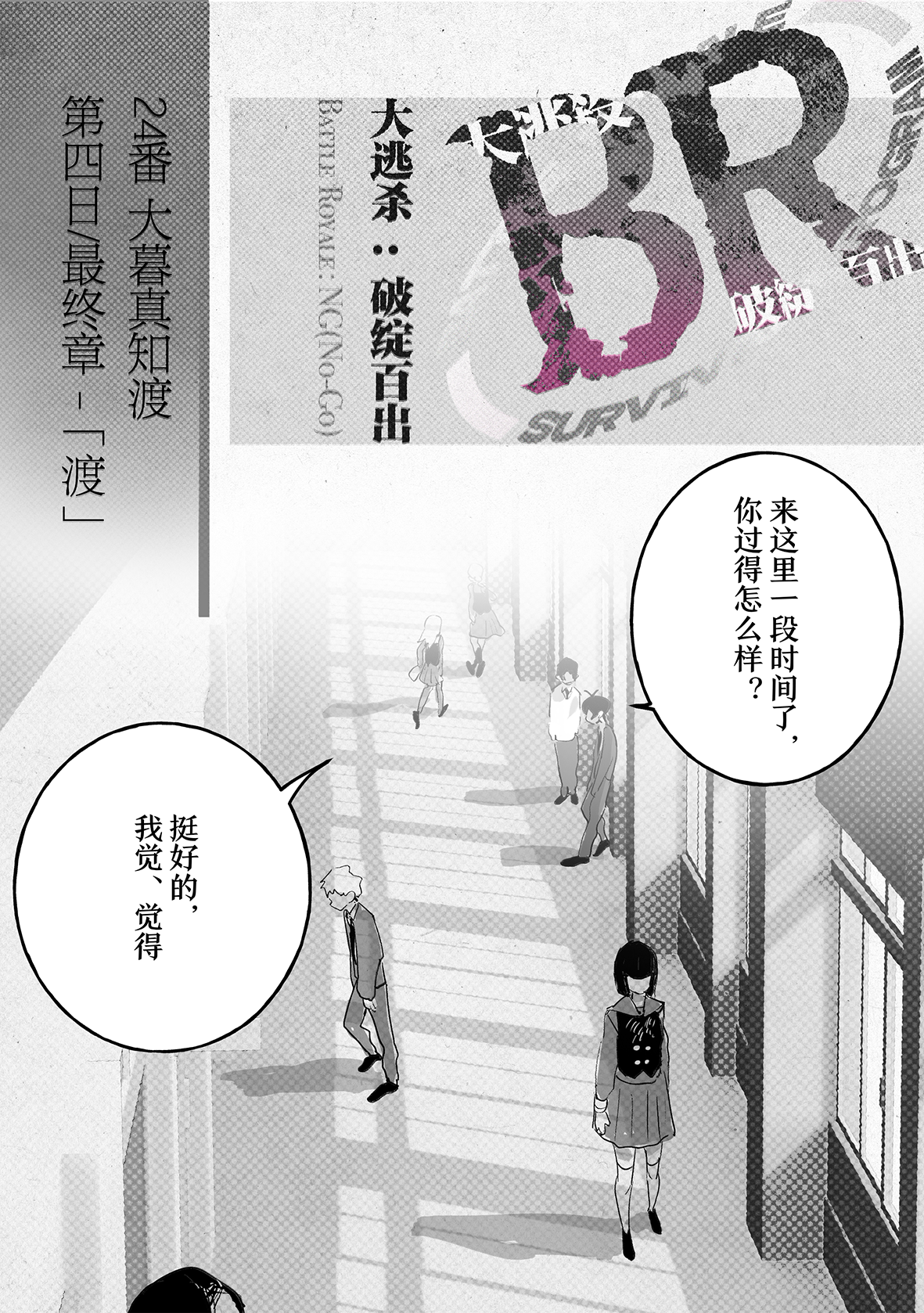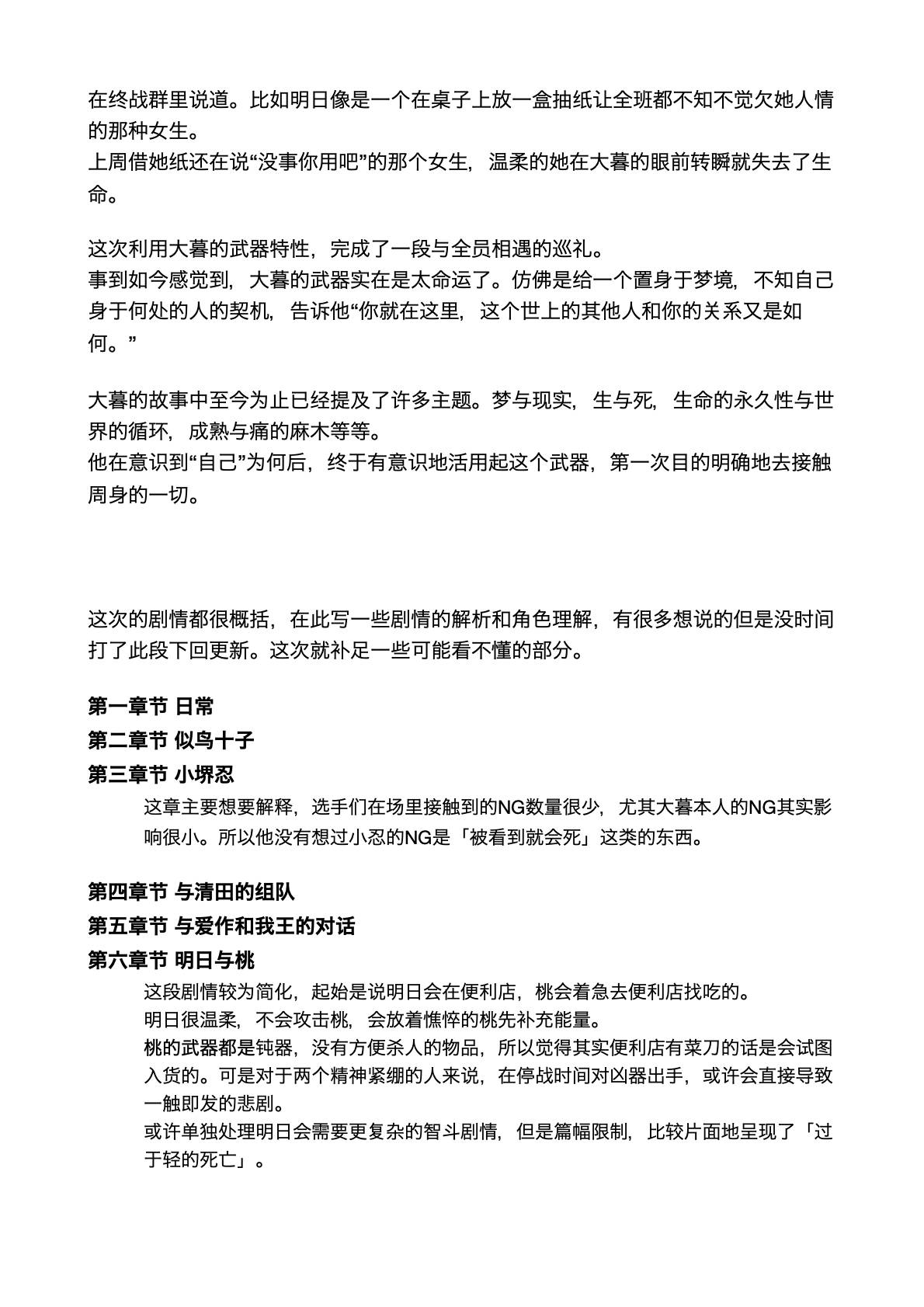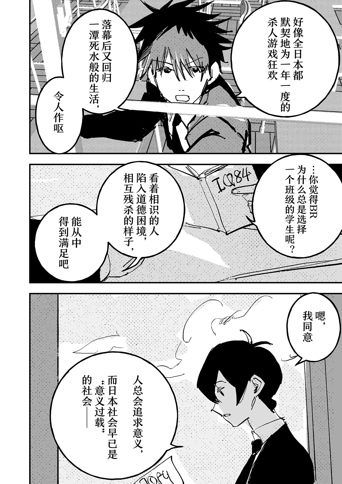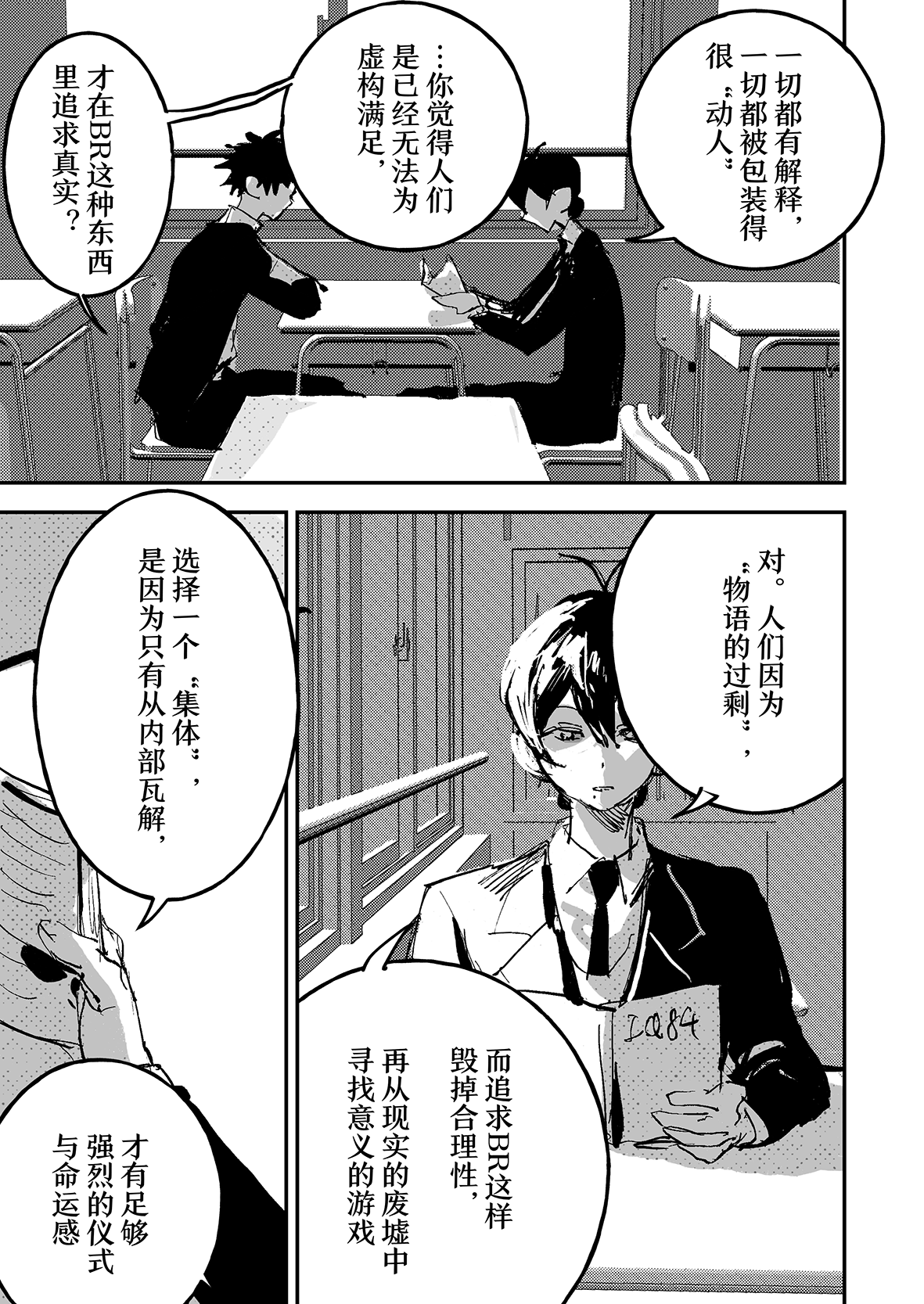 不过这也更加突出BR法的荒诞,唯有极端才能生存,也只有这种极端条件下,才更有契机去讨论生死、人类、社会这种宏大的命题,甚至去讨论如何去承担一个班级的生命(大家都是思辨达人(不是))。但跟着角色去思考,有一种意外的沉浸感,仿佛跟着大暮体验了整个过程一样,非常棒的故事!读完之后后劲很大,只希望大家安息(?