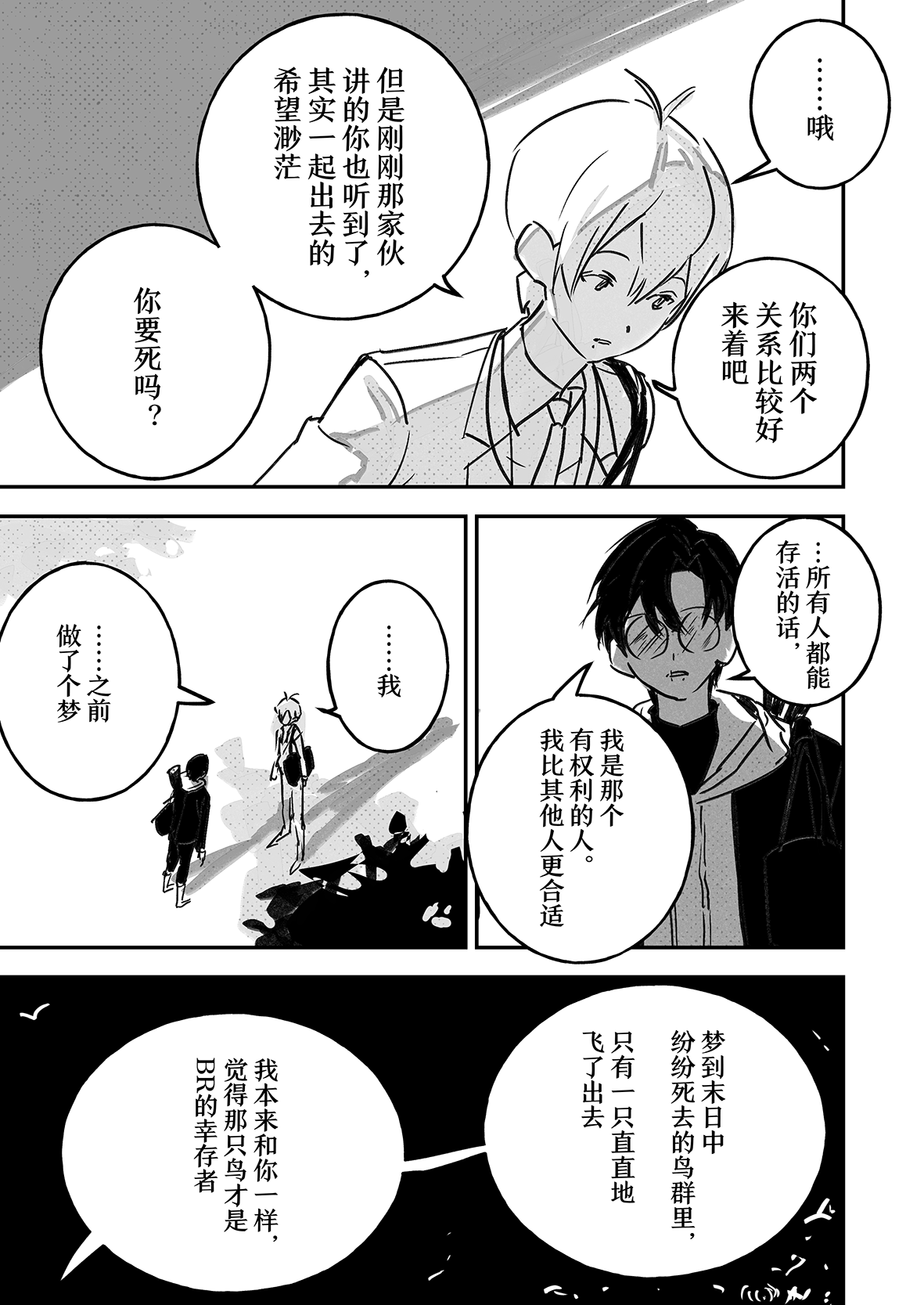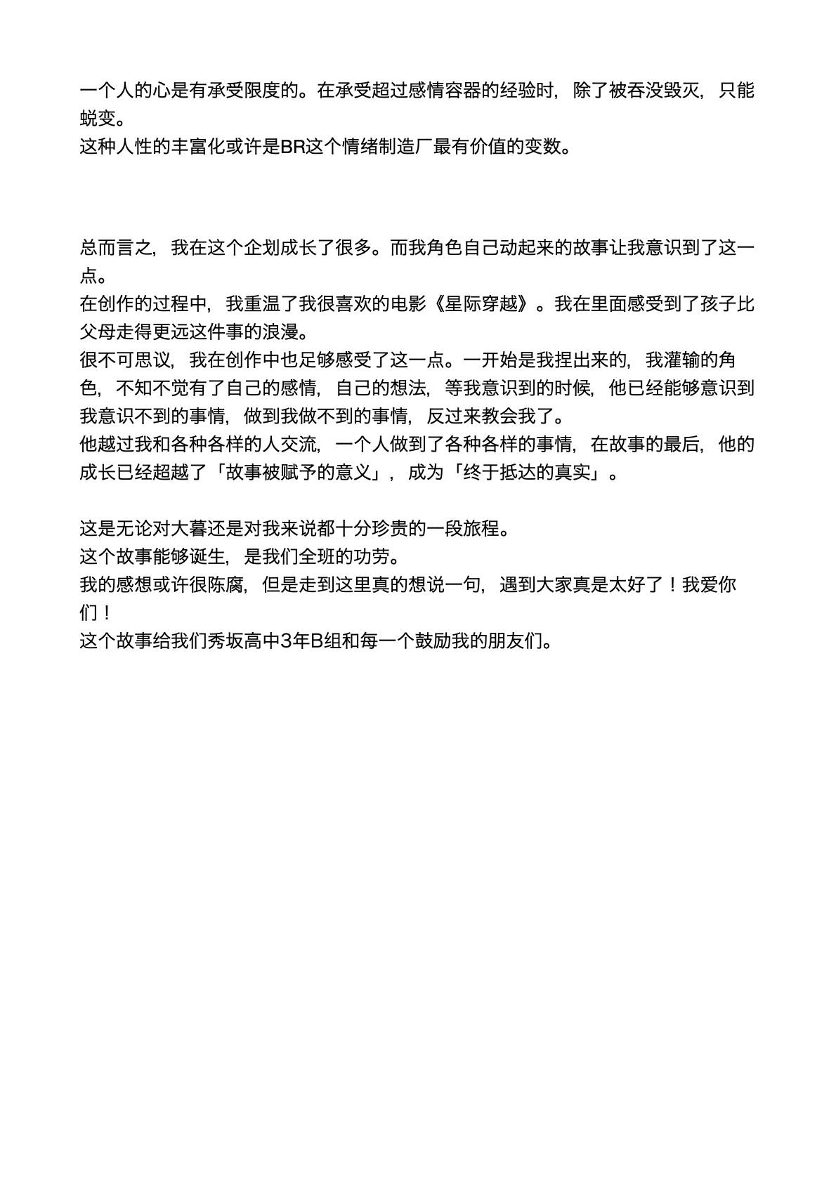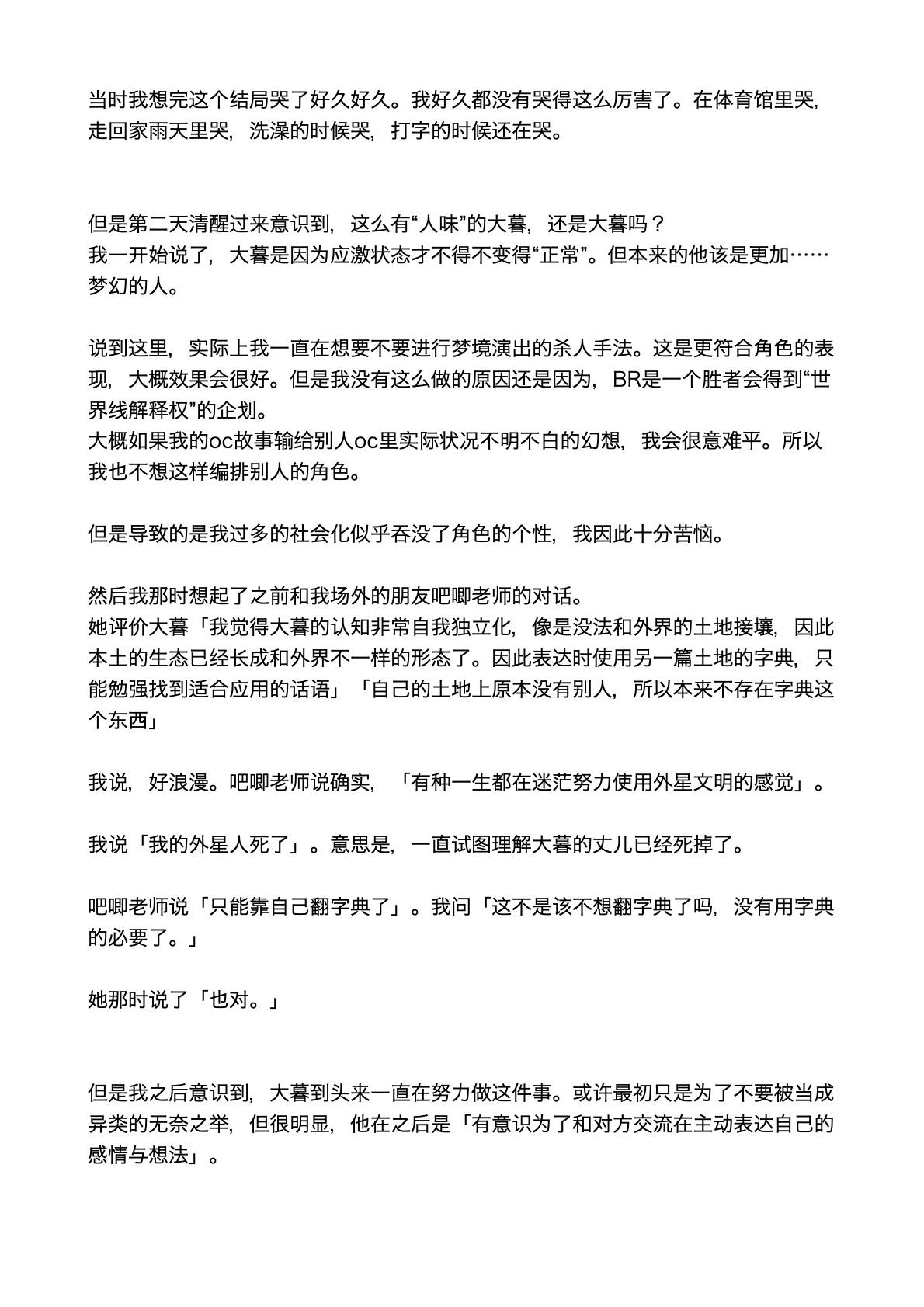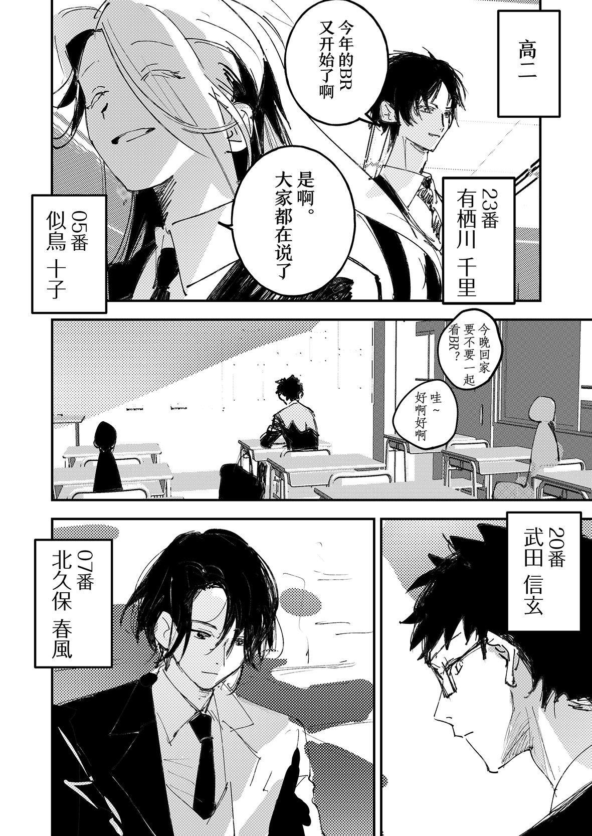 翻来覆去的看了好几遍,这真的是超越了我对br终战该怎么结束能画到什么程度的想象的神作...这居然是一个月内画出来的你中途甚至还花了点时间先画了第三日,太厉害了。全篇的情感我觉得是离了你就再也吃不到的美味,能感觉到每一个人都是活生生存在的人,这种已经再也回不去的日常开场就让我很想哭,贴合角色的程度已经贴到感觉我们全班都是你的oc的程度(oi