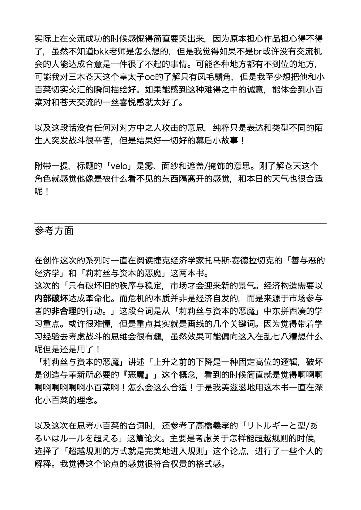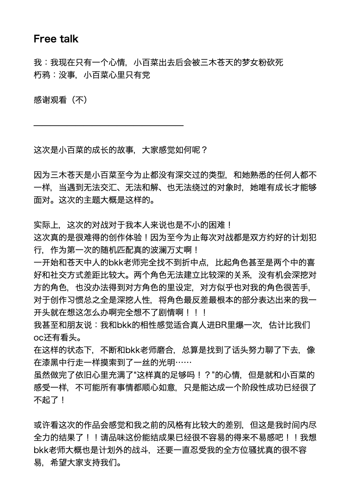 我也觉得这一战很命运,估计也是第一次有机会揪着说不通的人一直说下去,感觉这个角色的信念和气质等等一切都和小百菜太对立太有碰撞效果了。。。感谢阅读啊啊啊啊我会加油的!