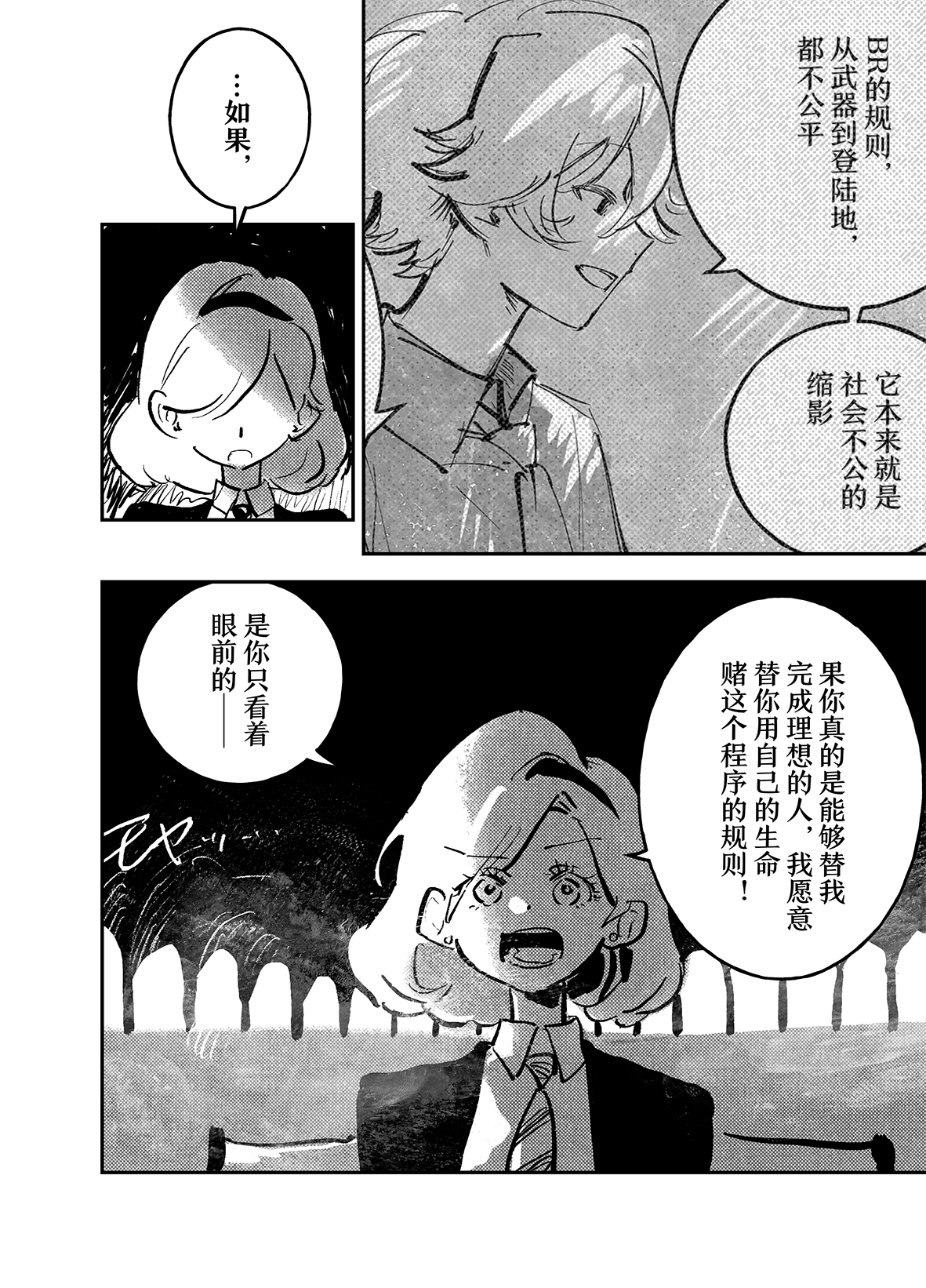 这篇两个人的观念冲突描绘的太好了,甚至从旁观者角度能理解小百菜和三木任何一个人的观念但同时又无比清晰地知道他们谁都不可能说服对方,从而为此抓心挠肺,好难过但是阅读体验上的情感回馈真的好爽……! 小百菜和三木两个人都有一些过去回忆或者现在笑的画面,但是两个人的笑容气质和意义简直天差地别啊啊,小百菜阳光纯粹的对立面简直就是三木笑起来的保留、琢磨不透,包括后面小百菜认真说服对方时两个人的情绪对比也把故事情绪拉得相当紧张,台词针锋相对更是精彩,看到小百菜被捅真的捏了把汗还好有怜怜T T 好天才啊编得画得!! 个人觉得小百菜的话语句句都十分有领袖气质和号召力,会让读者看了也想站在她身边,尤其是看到她想通境遇成长,和最后声嘶力竭的呐喊,有力得穿透画面直击内心了。好喜欢好喜欢最后“苍天啊”开始的部分,将强烈的情绪全部像钻石一样切割出来了……苍天的名字在这里也相当有效果,笑了一下接着哭了啊啊啊。 看完后记,牡丹老师辛苦了,虽然说和以往风格不一样但我特别特别特别喜欢这篇投稿的情绪表现,像是用尽全部力量破了迷雾,拨云见日之后又伸出手想把雾中尚在迷惘的人拉出来一样!