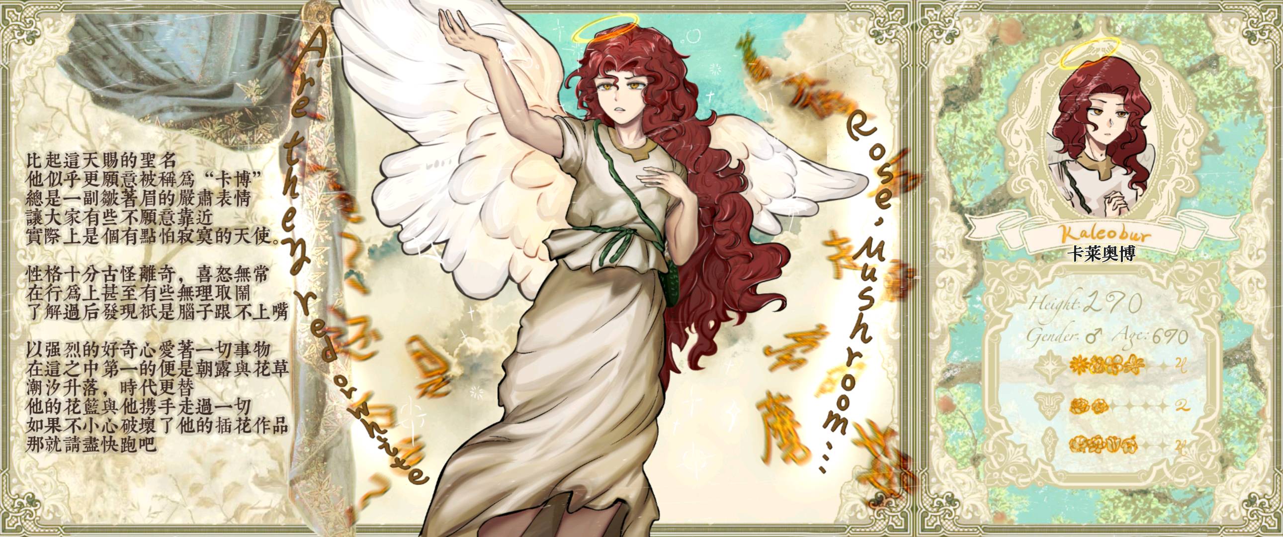 居然可以写背景?!那我写一下设卡上的谜题!谜底来源于《爱丽丝镜中奇遇记》中双胞胎兄弟给爱丽丝提出的诗句,原句是“庭院中玫瑰嫣红,走廊旁蘑菇蓬松”爱丽丝询问他们为什么要把玫瑰和蘑菇联系到一起,他们说“因为玫瑰和蘑菇有关系”对应的是《爱丽丝梦游仙境》中,红心女王提出的一条法律:当雨后长出蘑菇时,庭院中的玫瑰必须是红色。所以谜底是——庭院的玫瑰和蘑菇都必须是红色!就像卡博的头发!