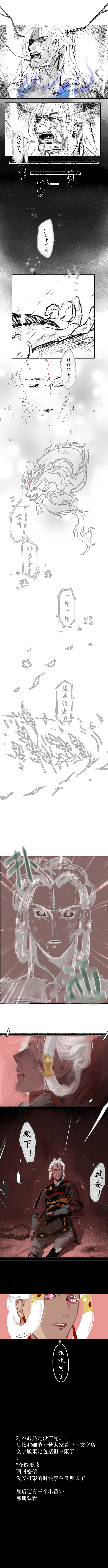 死线大滑铲了orz…… 漫画还是没有搓完,辛苦大家食用一遍文。 漫画里没有的细节和暗线都在文里,还有三个小番外ww 前面三页是纯草稿,后面是精一点点的草稿ww 【省流】: 武安弑君,异化,返京夺嫡摄政。 赤梁二王子被武安捆的死死的,带回去做质子了 总而言之就是皇帝我藏起来了,造谣圣旨说变异武安有仙缘所以传位武安。 关联: 花既白线:https://elfartworld.com/works/9738035 【妖异界APP】:https://yaoyijie.com/ 赤梁二王子线:https://elfartworld.com/works/9737883 【妖异界APP】:https://yaoyijie.com/
