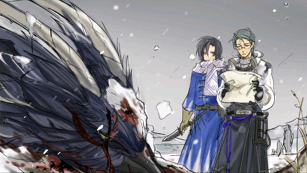 昨夜起,弗拉西亚地区迎来大范围降雪。今晨,在猎人们的协助下,书士队前往临雪海滨,对清晨观测到的异常现象展开调查。 现场显示,沿岸分布少量新近坠落的岩石碎屑,初步推测其来源为邻近山崖,可能因外力撞击而脱落。不远处,队伍发现一头重伤的毕月龙个体。其体表布满小型怪物啃咬留下的伤痕,周围地面残留凌乱的血迹与明显拖拽痕。 当有人靠近时,该个体除双眼球仍能微弱颤动外,几乎无其他反应,判断已暂时丧失捕食与行动能力。具体受伤原因与前因后续仍需进一步调查。 ——报告完毕。