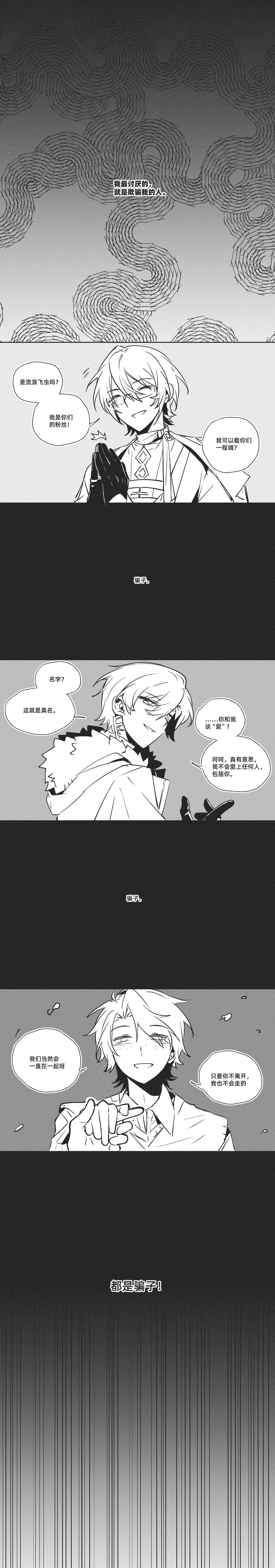 封面我真的要笑死了是每章一meme概念吗!但是确实这章也算公路旅行吧!? 感觉提兰的认知倒是十分简单?把他人说出的誓言当真,因为誓言被毁掉感到背叛,对人类无法永恒的心感到憎恶,这样的提兰其实也是一个真正意义上的人了。以及啊我草这个粉毛男这个前夫哥怎么这么坏啊jpg 噢卧槽怎么自己报上名号了,被满嘴谎话的骗子NO.3惹到了吗(提兰:一天天本来就烦。)生气的提兰好帅呢,ps不是滤镜。还有树莓还是好萌,,我们飞虫姐弟是不是也让提兰觉得人类有时候蛮可爱的(???)哪里没有完成度了好喜欢啊!!!