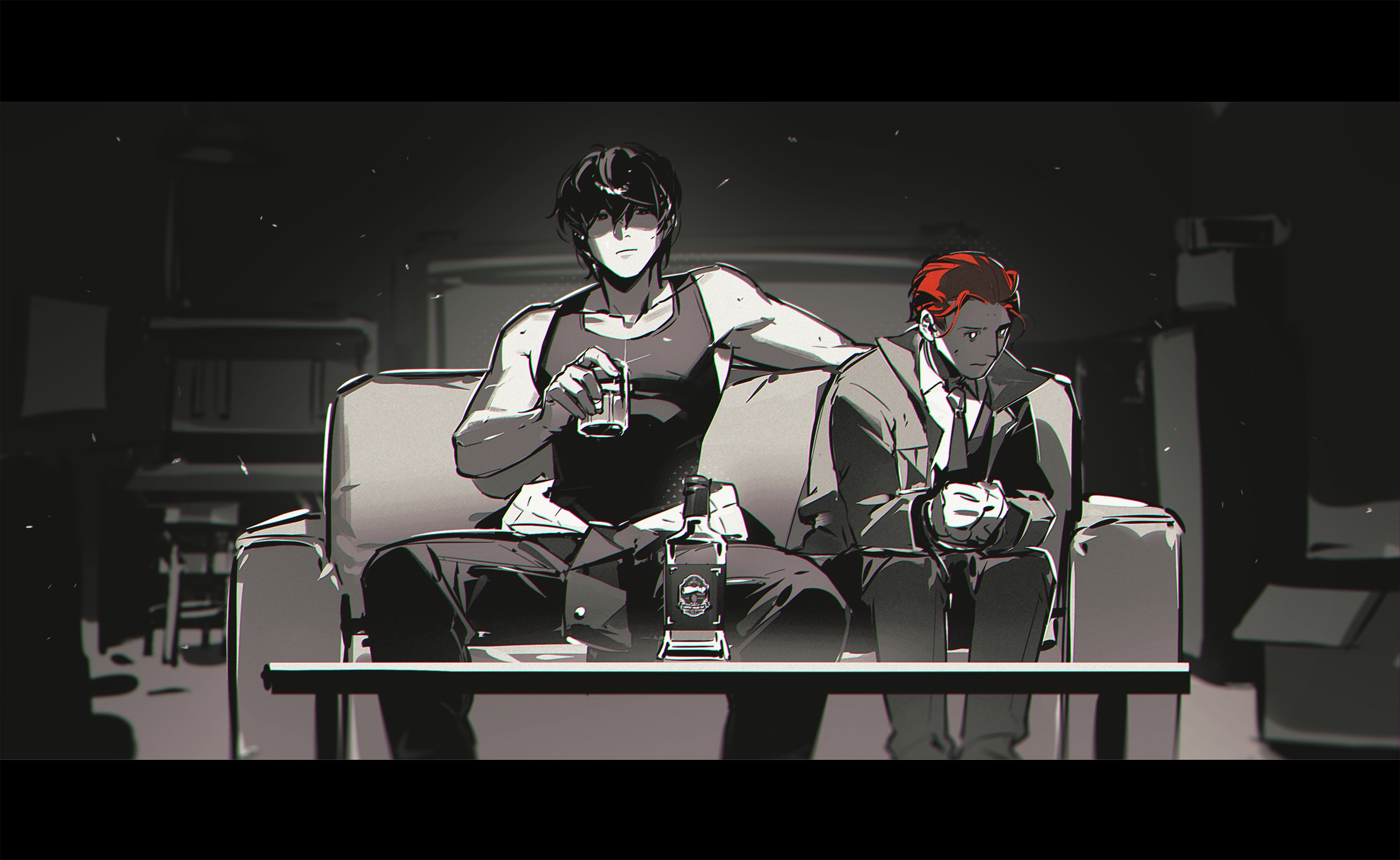 散发的杰瑞米妙啊! 就是因为有插图,我才能对“杰瑞米身处险境前途未知的情况下还有色心”完全理解!纳什的身材真是无可挑剔! 一起坐沙发那张太棒了,体格差,主客(?)立场,还没发难的纳什和惴惴不安的杰瑞米,一触即发。 啊啊啊看图又回忆起汗湿的手蹭过胸毛……可汗和毛子(什么鬼) 这些插图把两人性格丰富的层次和非套路的部分展现出来了!杰瑞米开枪的那个眼神真棒!