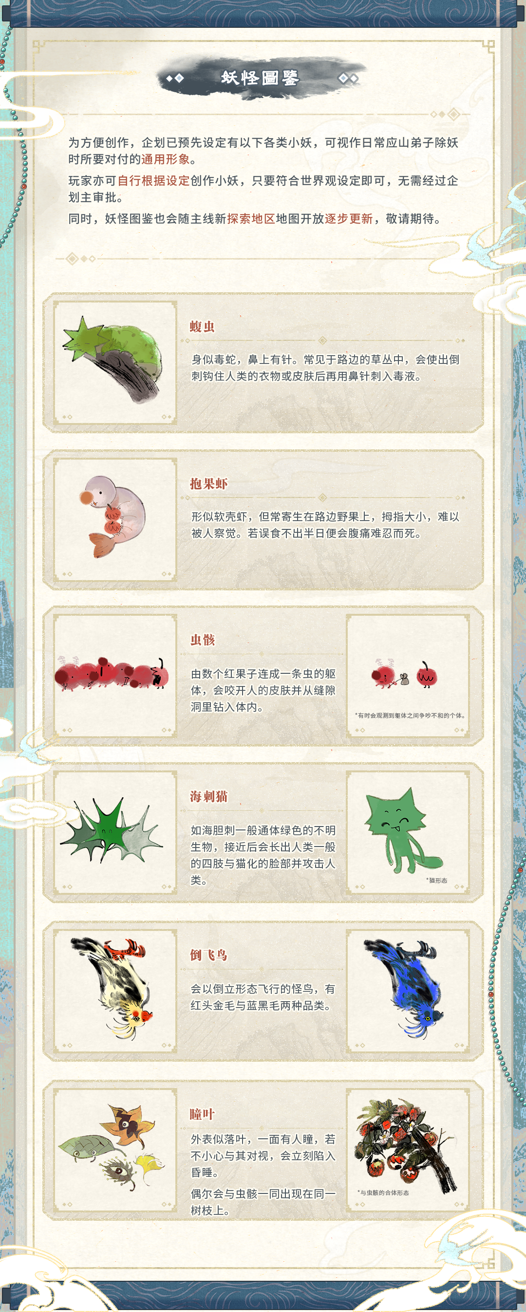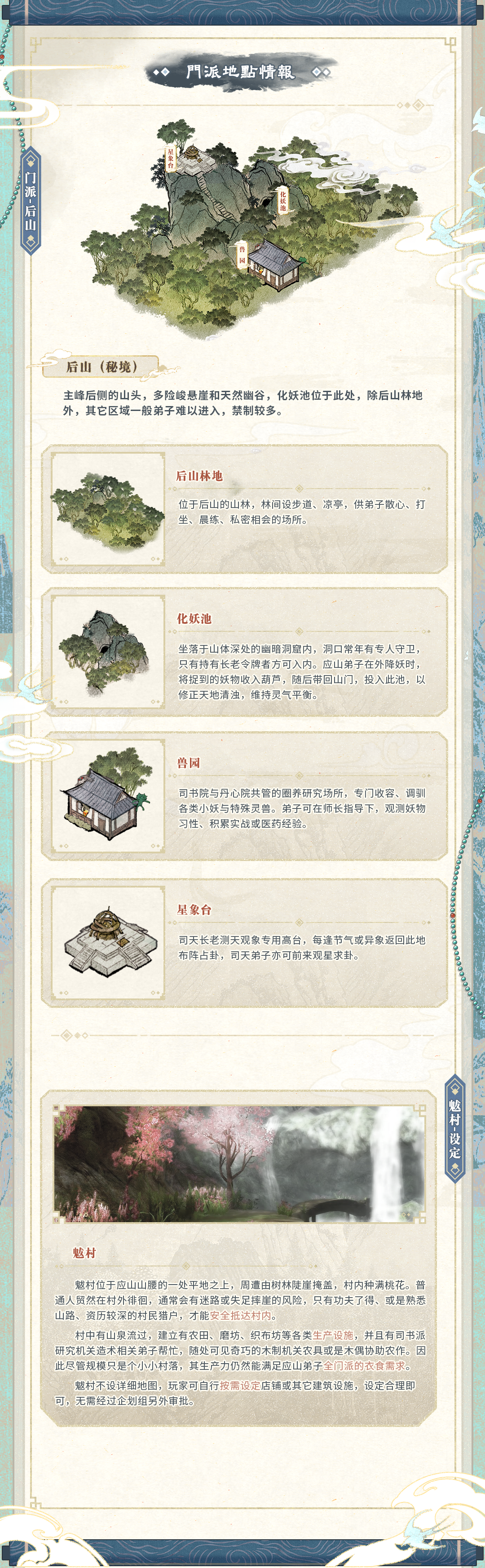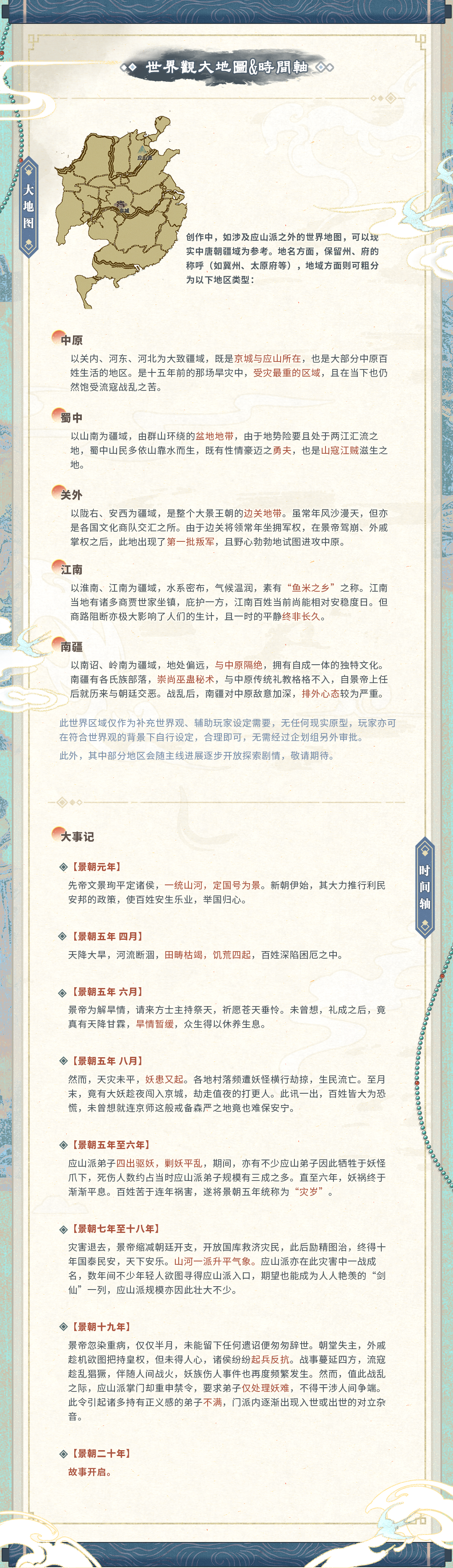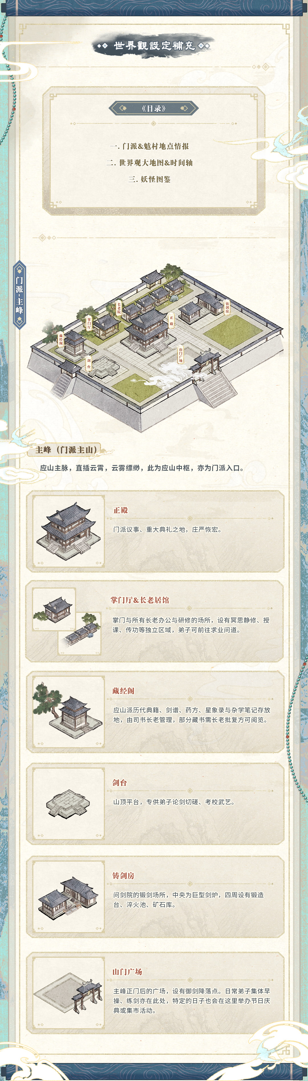 【应山问妖录】设定补充 此为企划《应山问妖录》的地图/世界观/妖物图鉴等补充。 P2:门派-主峰地图 P3:门派-侧峰地图 P4:门派-后山地图&魃村信息 P5:世界观地图&大事记 P6:妖怪图鉴 主企划书见:https://elfartworld.com/works/9743543/