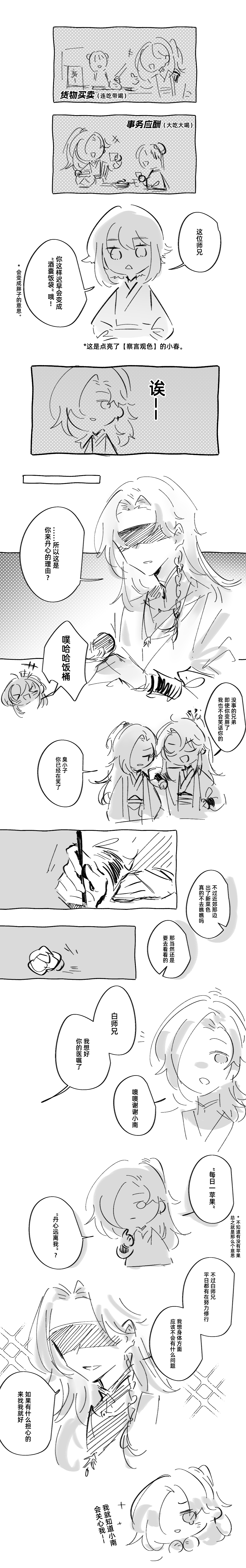 一下子画了这么多,好强啊!总觉得酒囊饭袋好像不是这么用的,小春虽然点了察言观色技能,但语言的艺术还有待长进啊。丹心和苹果不对付的话,能否尝试用虫骸整蛊楚南师兄……(?