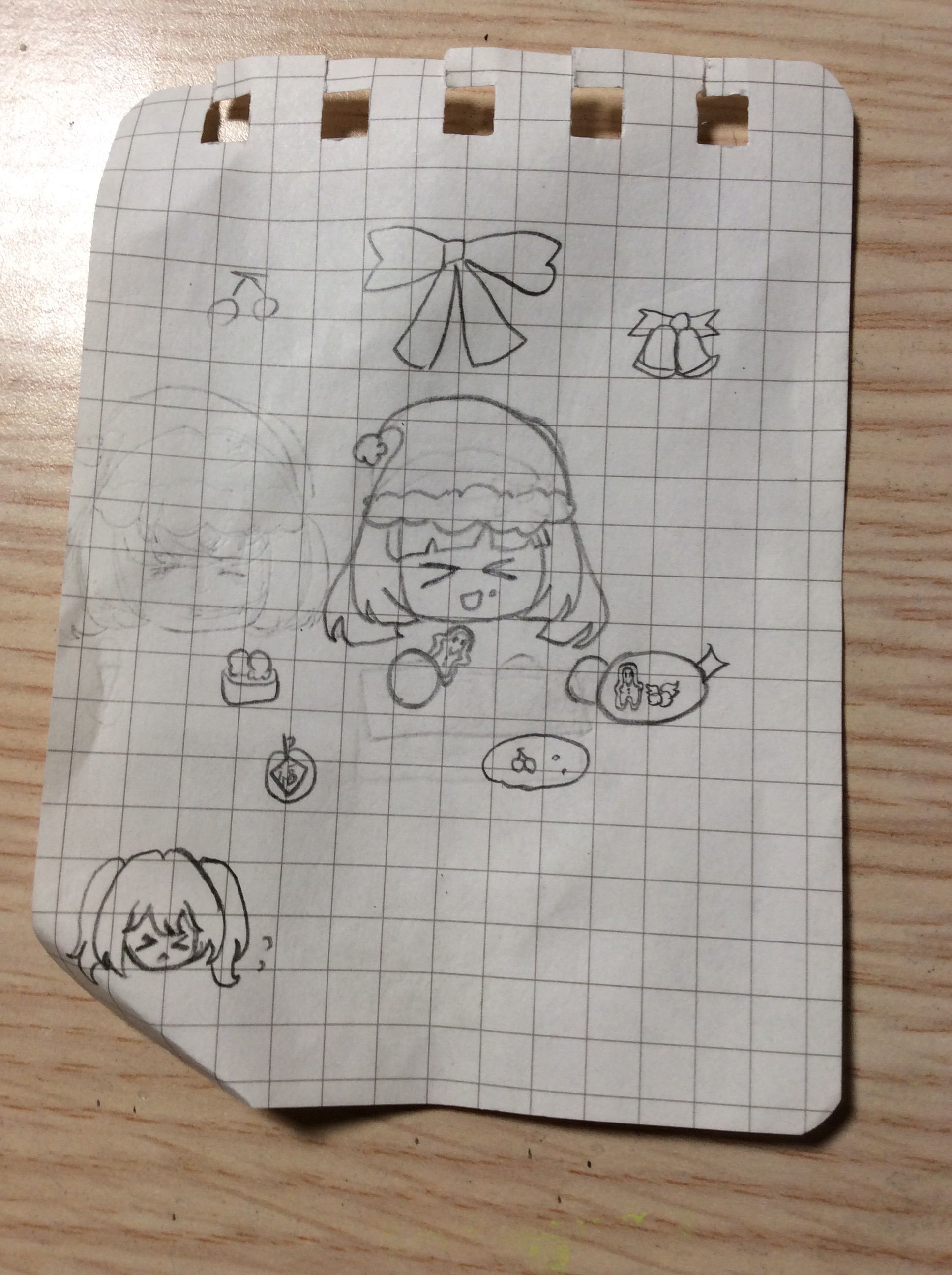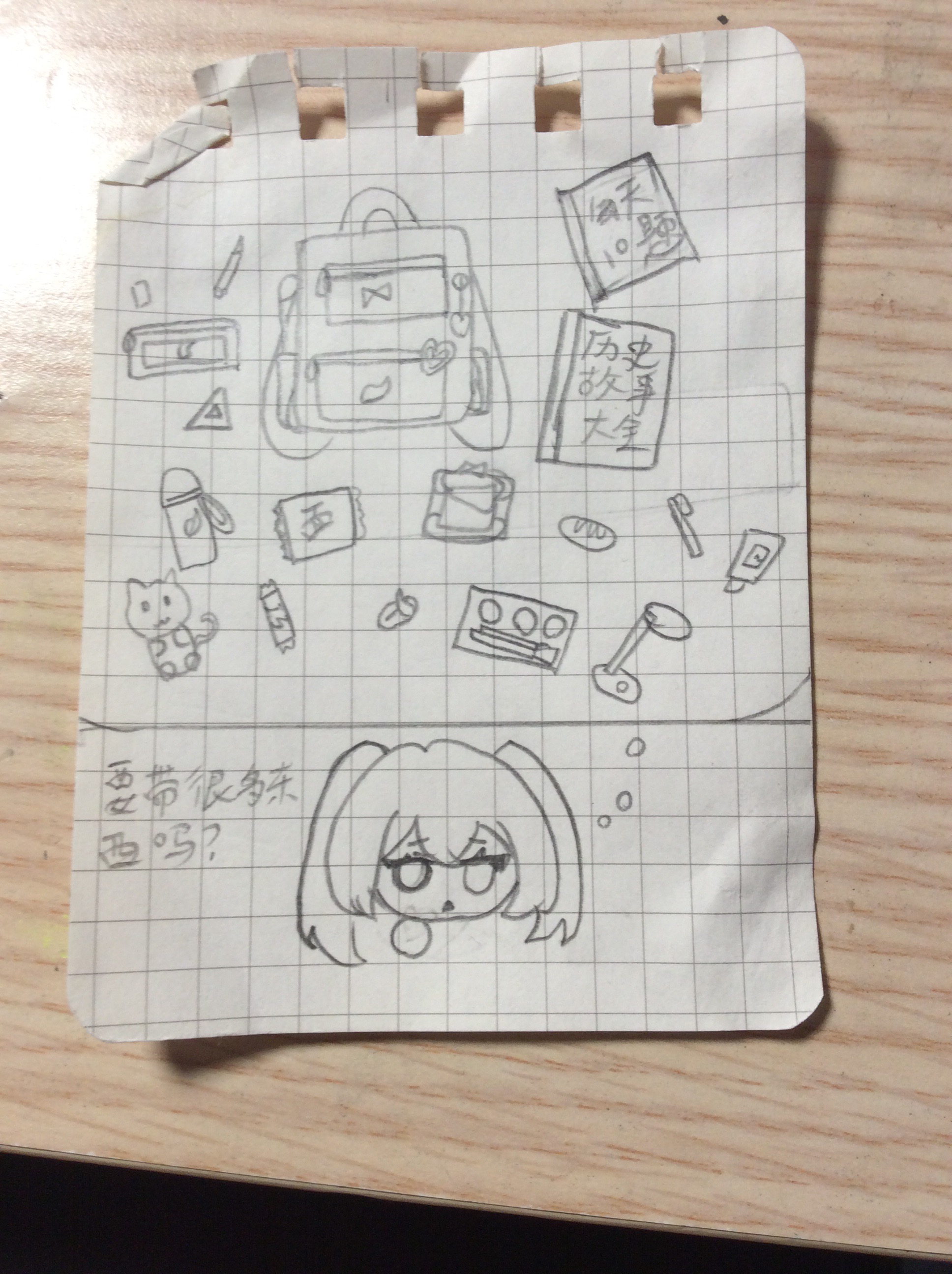 手绘可爱~✧⁺⸜(●˙▾˙●)⸝⁺✧画了好多随身物品哦,怎么好像有方便面和面包和……台灯?!《历史故事大全》借我看! 第二张咱俩在什么上头呀?小薄荷怎么吐魂了?好大的蛋糕! 第三张我吃姜饼人!好耶!小薄荷为何躲在角落里,过来一起吃嘛(塞) 第五张的5不太懂,总之就是“衣服按她身上的来,不要自行发挥改造”的意思吧?