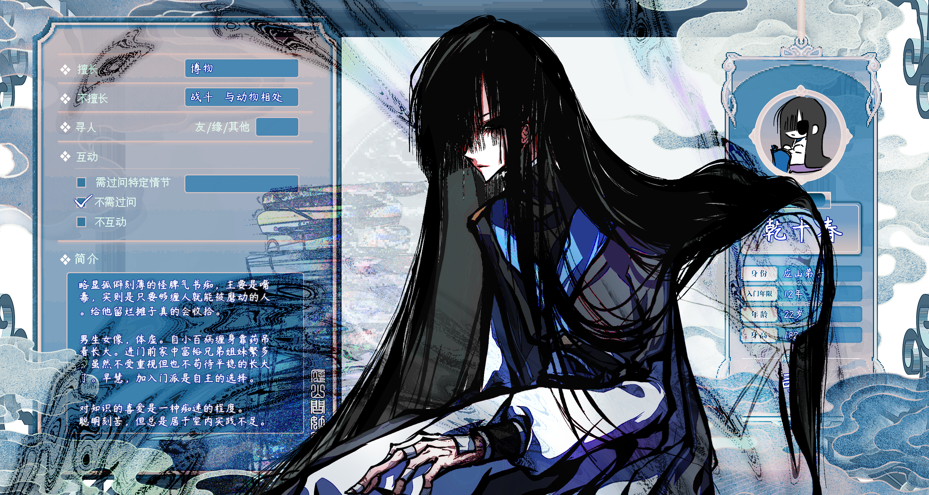 从出生起就是在等死,加入门派后却没选择走丹心的路,从小展现出的对书籍的痴迷是意料之外的事。虽求长命,但若一生只为生而生未免太可悲了。 所以很刻苦的一个原因也是活一天少一天,偷来一样的命很有时间紧迫感捏,短暂的人生中但凡能学到多一点再多一点点的东西都是好的