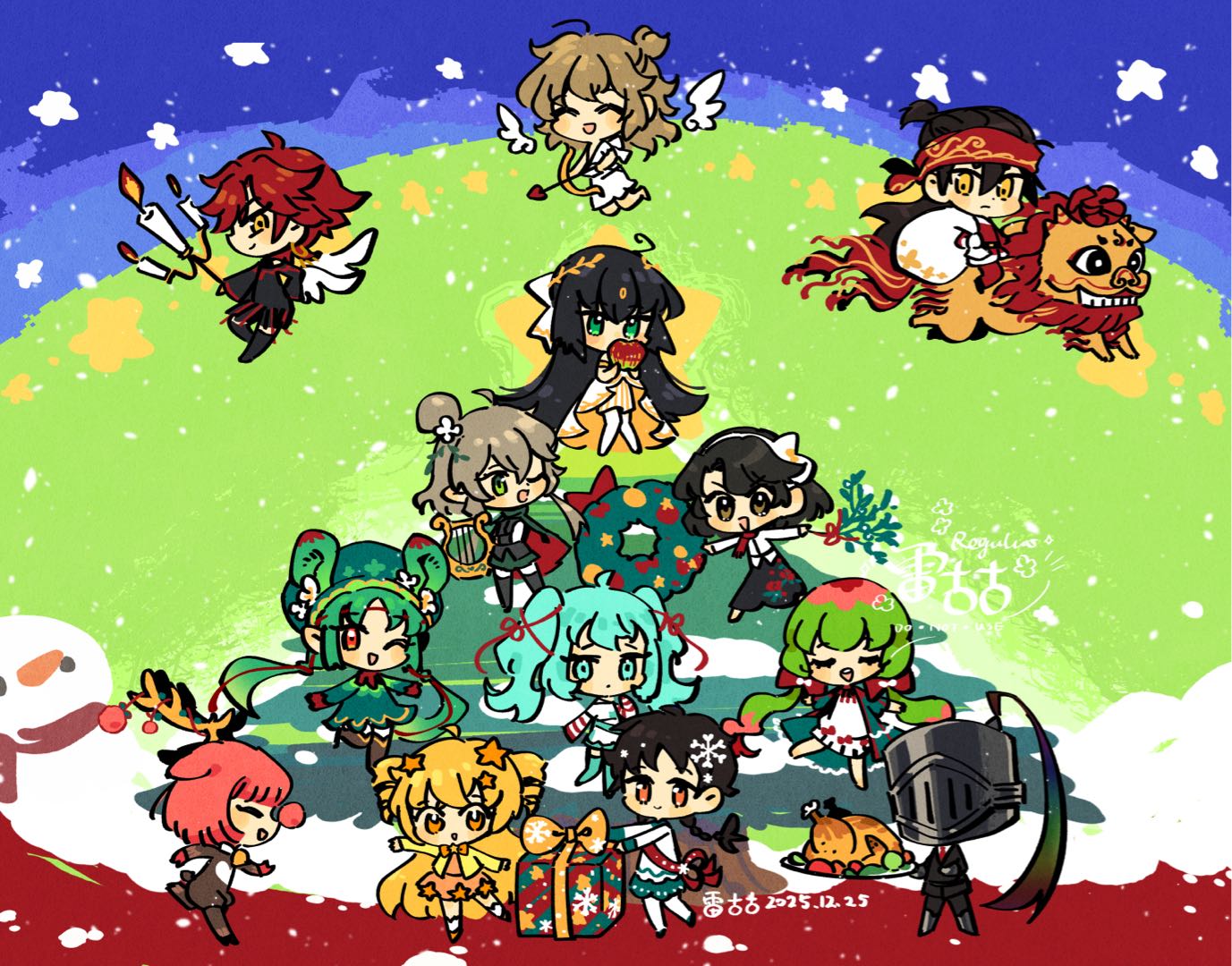 P1是10.5个OC,P2加入2.5个别人的OC 不知不觉就变成了年终总结一样的东西了! 我觉得背景蓝色比绿色好看,但缇可中之人更喜欢绿色。 绘画过程视频在此:https://www.bilibili.com/video/BV1zJBiBfEYY/