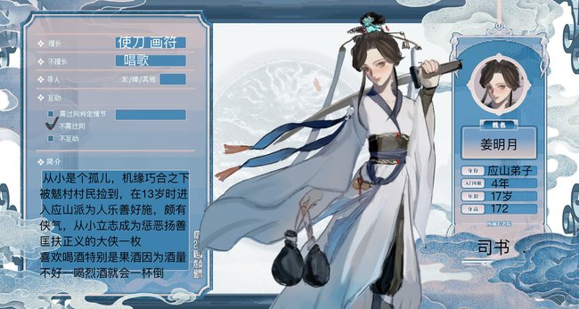 从小是个孤儿,机缘巧合之下被魃村村民捡到,在13岁时进入应山派为人乐善好施,颇有侠气,从小立志成为惩恶扬善匡扶正义的大侠一枚 喜欢喝酒特别是果酒因为酒量不好一喝烈酒就会一杯倒