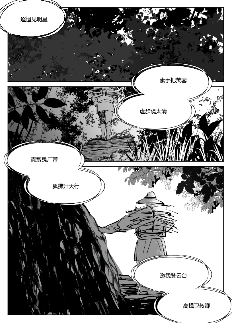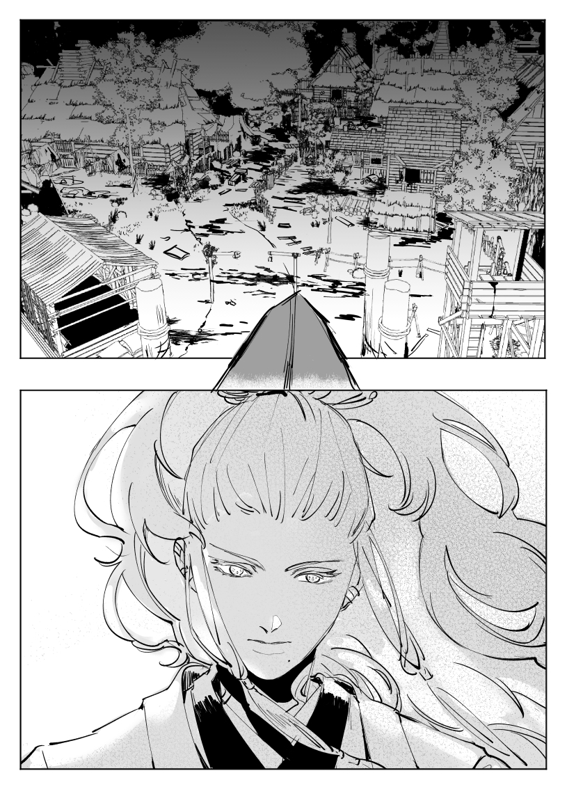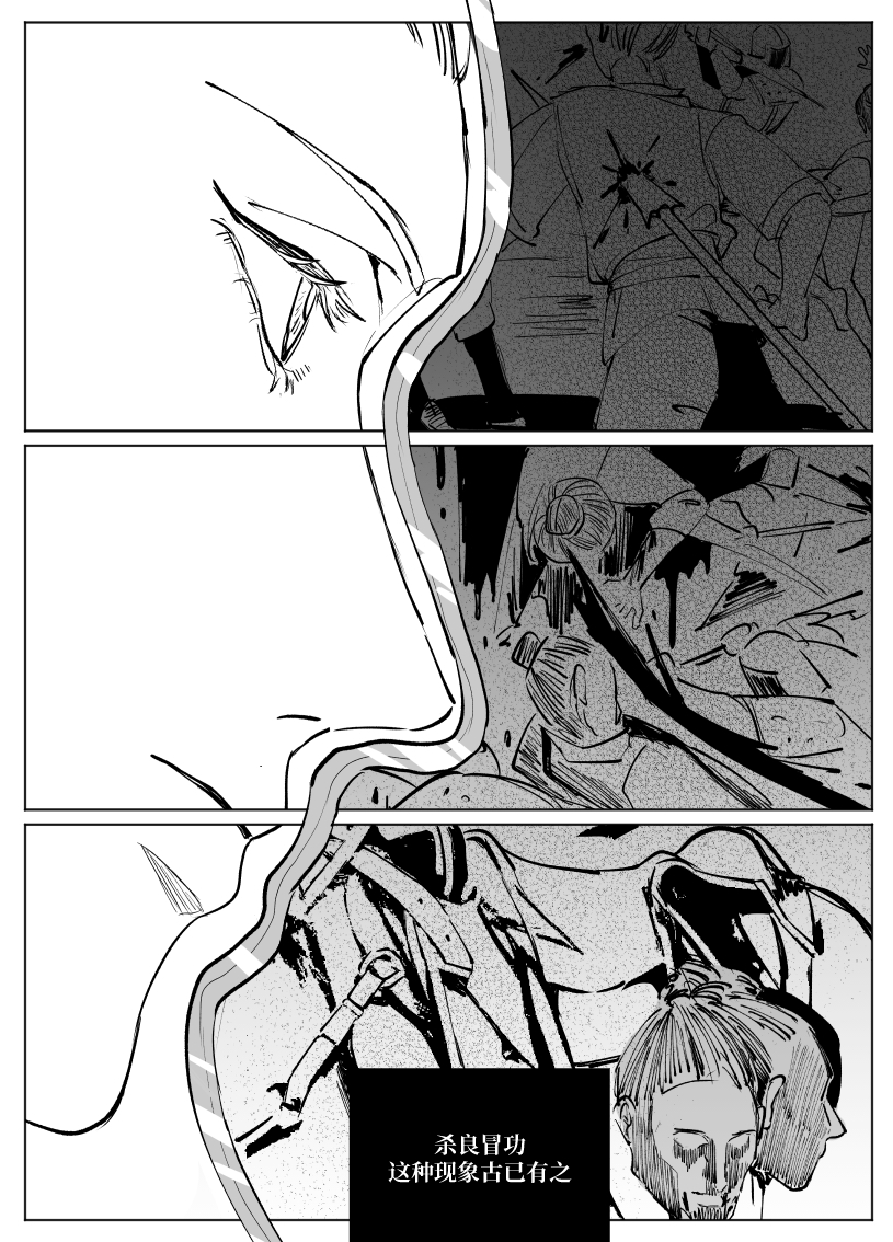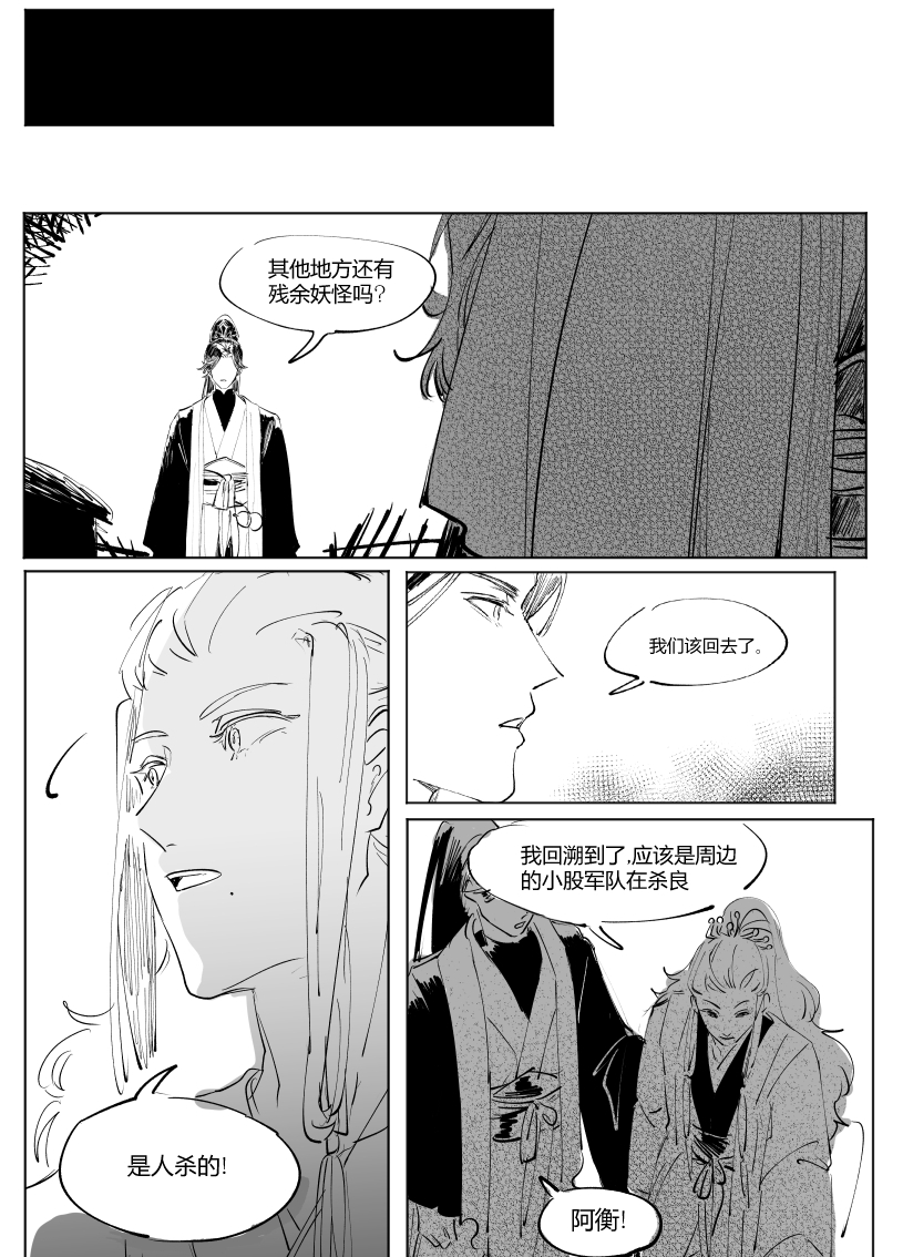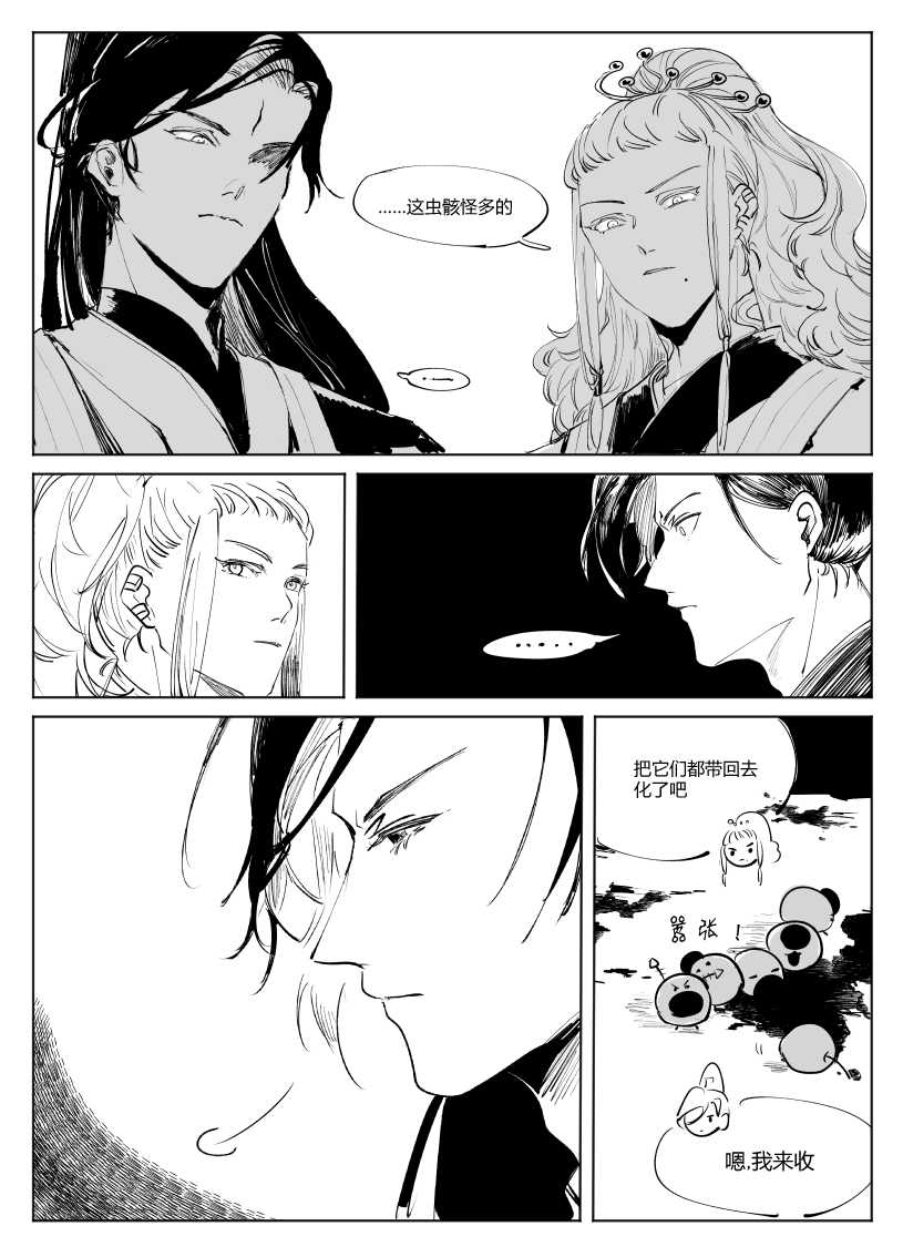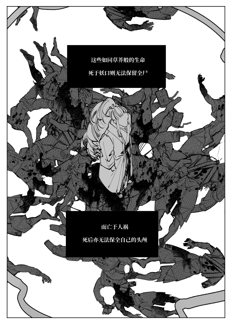 好强大的黑白表现力……村子染血、口含虫骸的头颅几页都非常的震撼,这就是页漫的魅力吗……没有想到会从天灾与人祸这样永恒的话题展开,眼前已经浮现出了兵戈之下的乱世扬尘,准备开始哭了TT角色部分恰到好处的信息量把二人的性格与分歧的种子都表现得很鲜明了,好期待后续发展!以及虫骸画得好可爱……衡子哥好帅……好可爱……