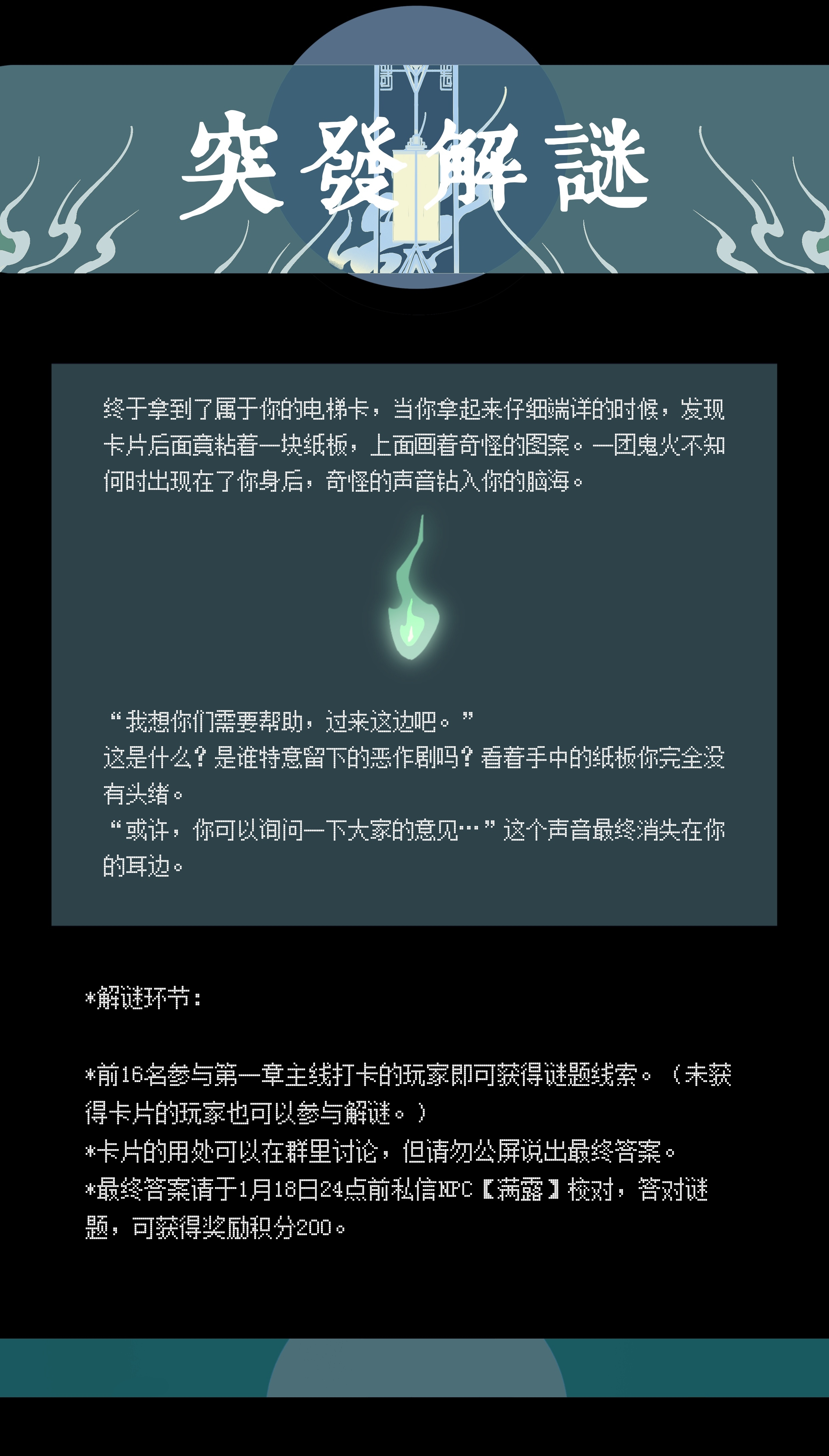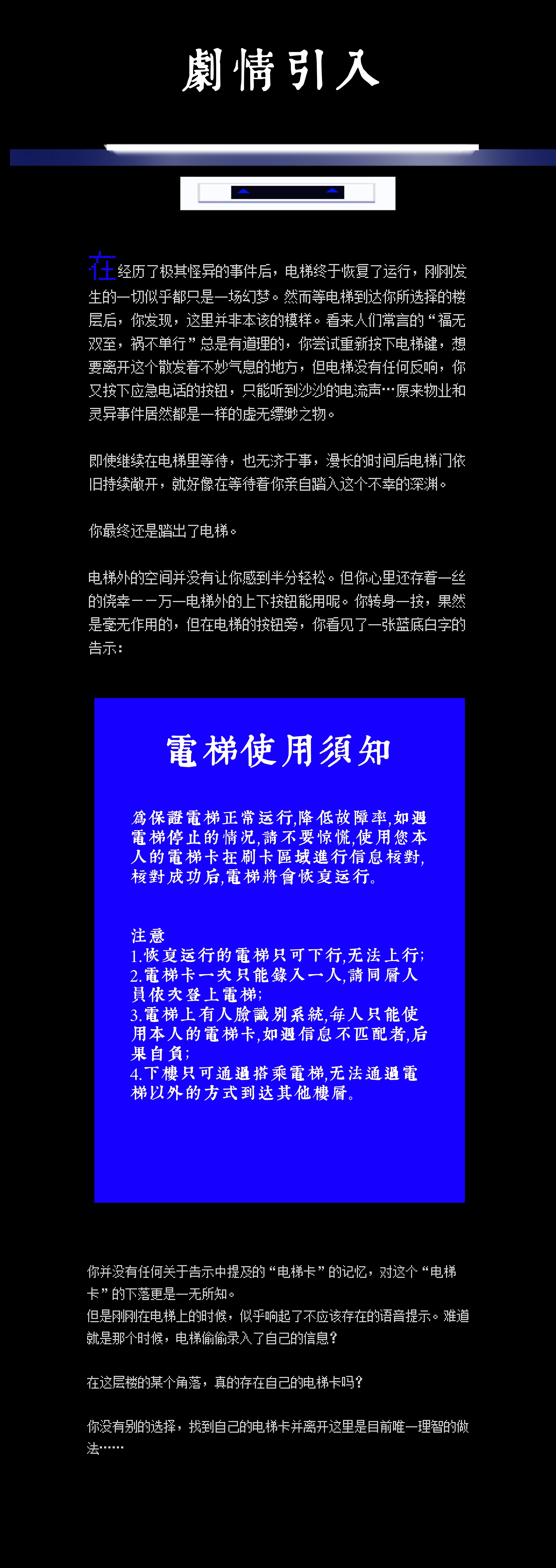 *各位玩家* **欢迎乘梯** 现已公布第一项任务——寻找你的电梯卡吧! ⚠️主线打卡须知:至少精草图1p/800字文,上传elf并选择主线第一章tag,可获得积分500 。打卡成功默认拿到电梯卡,不需要在创作中提及。 ⚠️主线打卡时间:1月5日 -1月18日晚24:00,主线剧情为必须打卡内容,若超时未能打卡,视为角色死亡。(每人有一次补卡机会,在截至打卡时间后的十天内补卡,可视为没有死亡。)