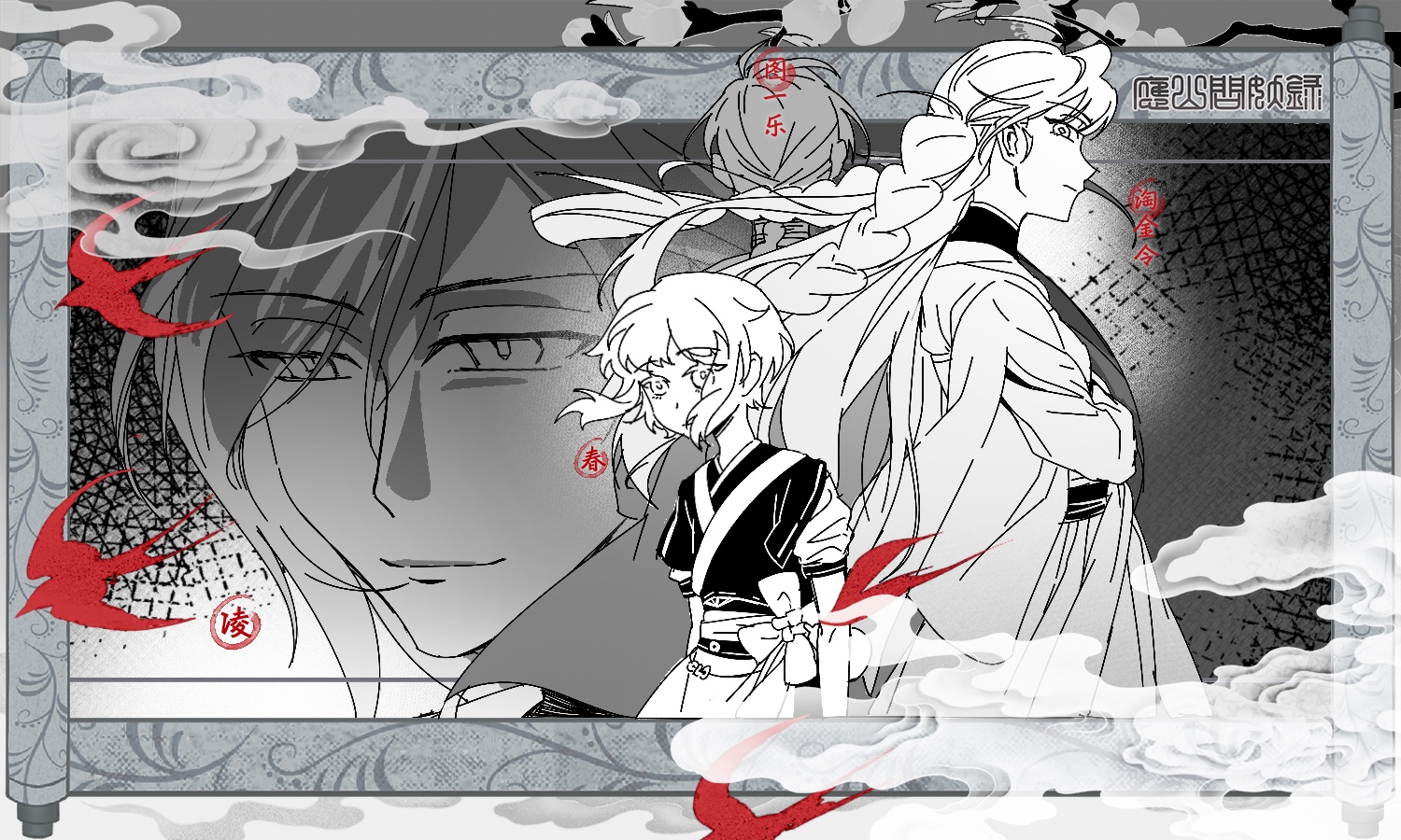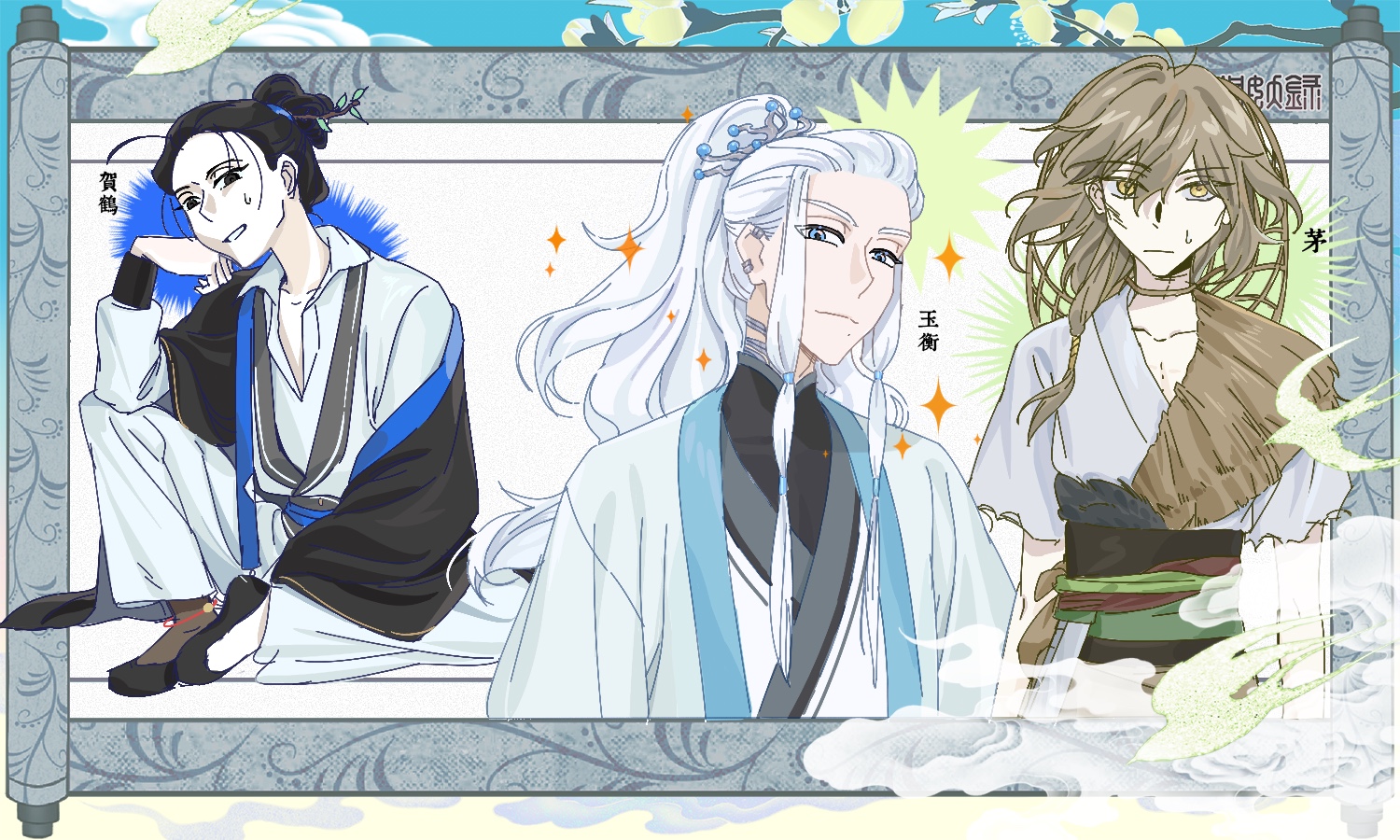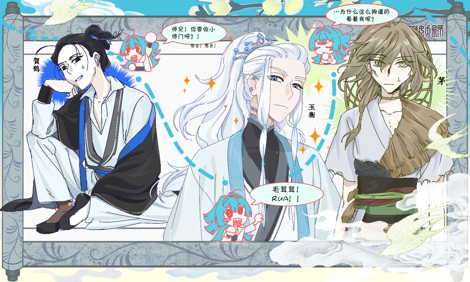 大log!三(四?)人组居然有一张单独的画卷,就像动画OP的某一个登场人物定格镜头。哥哥看起来反派一样哎,色感好棒……蓝精灵太萌了亮晶晶的,好喜欢蓝色圣诞树发型!