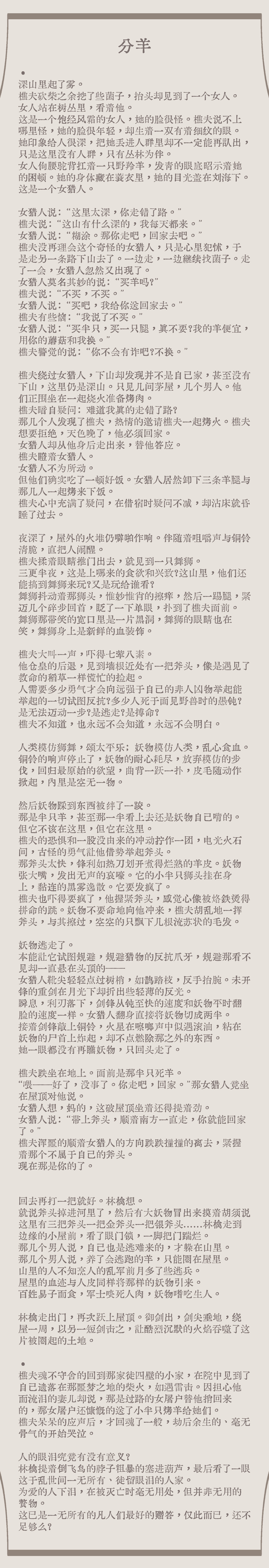 OMG好喜欢,,,首先演pa好!其次文章也写太好了?用屠户视角写感觉更帅了啊啊,突然出现的奇怪女人,再三提出有点诡异的要求……氛围就这样一点点铺陈开来 !被最后把柴送回去的情节微妙地戳中了,对屠夫来说这是不是诡谲的妖怪时间和现实链接的锚点呢?师姐真的是很好的人?