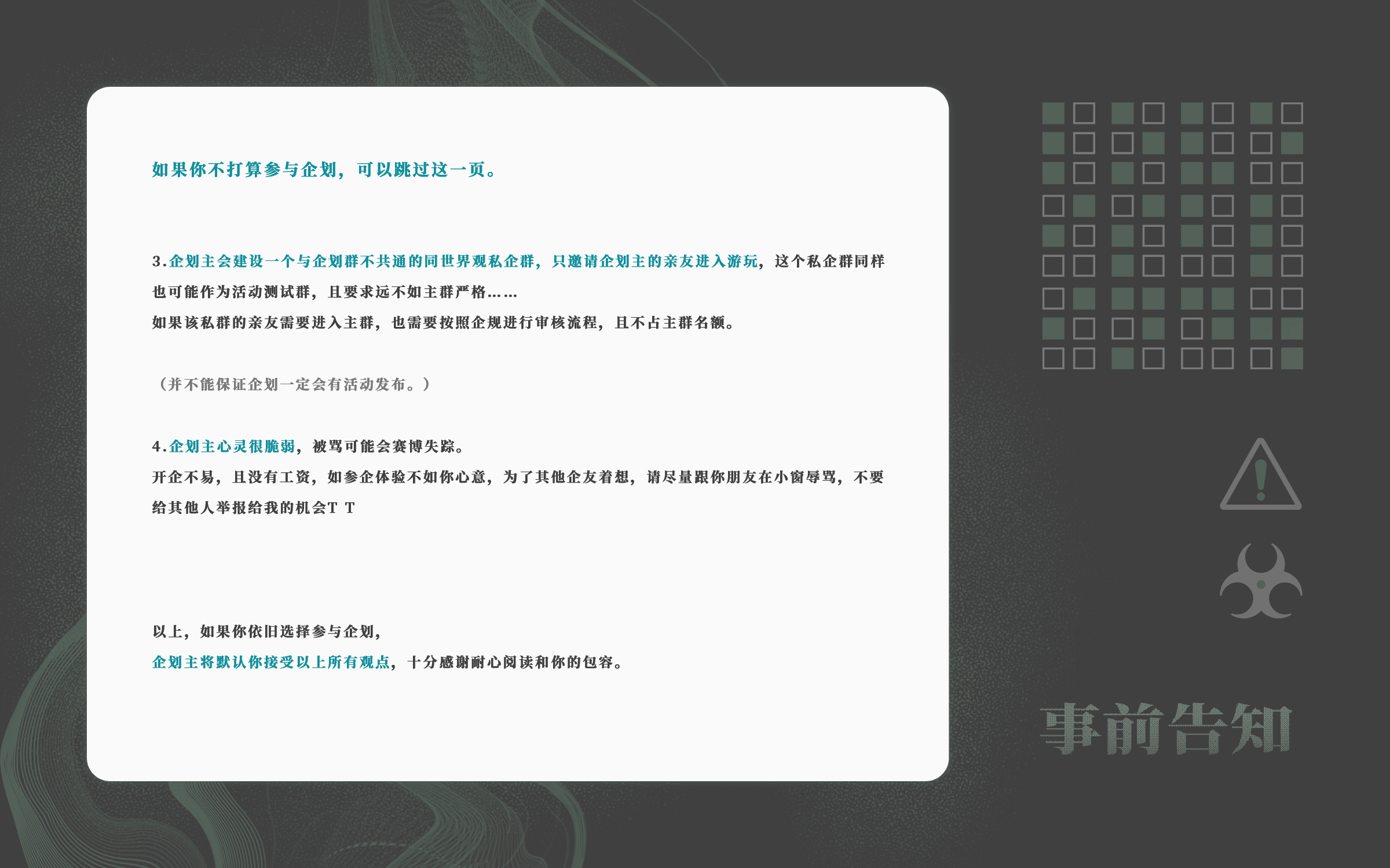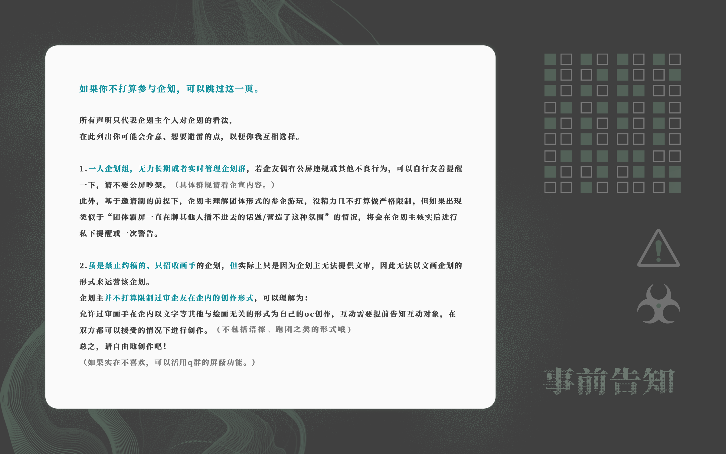 *如果不能接受审核要求和事前告知,可以不参与企划及时止损,感谢理解。