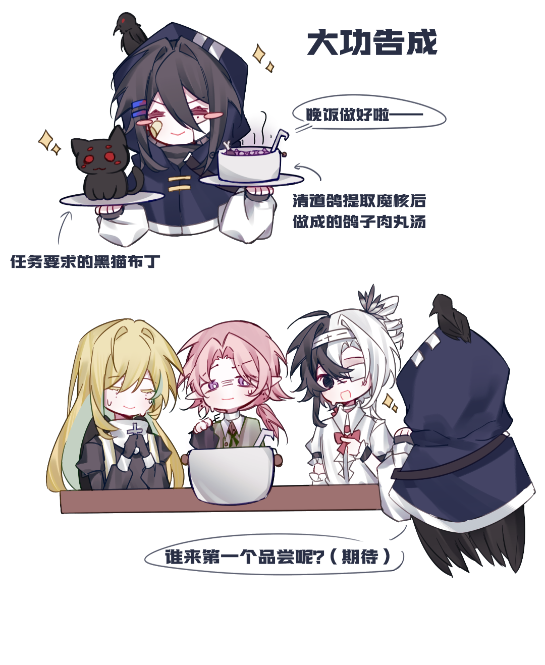 【支线任务打卡】《这甜点能吃吗?》 接到委托的小乌鸦在搅布丁液的时候,看着提取魔核放到一边的清道鸽,突然有了个好(?)主意? 不过做出来的汤为什么离火还在咕嘟咕嘟冒泡呢?