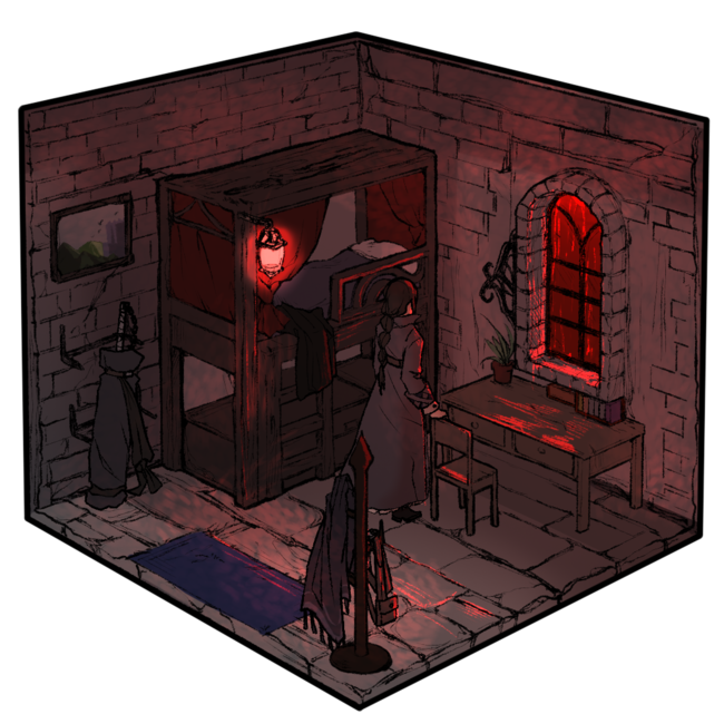 梅霏瑟走进自己的屋内,看着这让人心情烦躁的恐怖的红,却也只是褪去行装,出神地望着窗外的世界。 【旅馆】的接纳无疑是及时的,像是这样一个私人空间也总是令人安心。只是她仍然不放心…… 怪物,人,气候,一切来的太突然,打破了一切计划。 今晚,就在武器旁小憩好了。