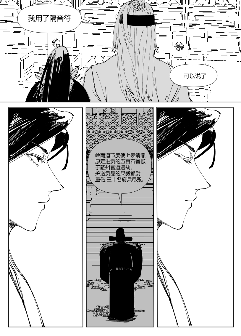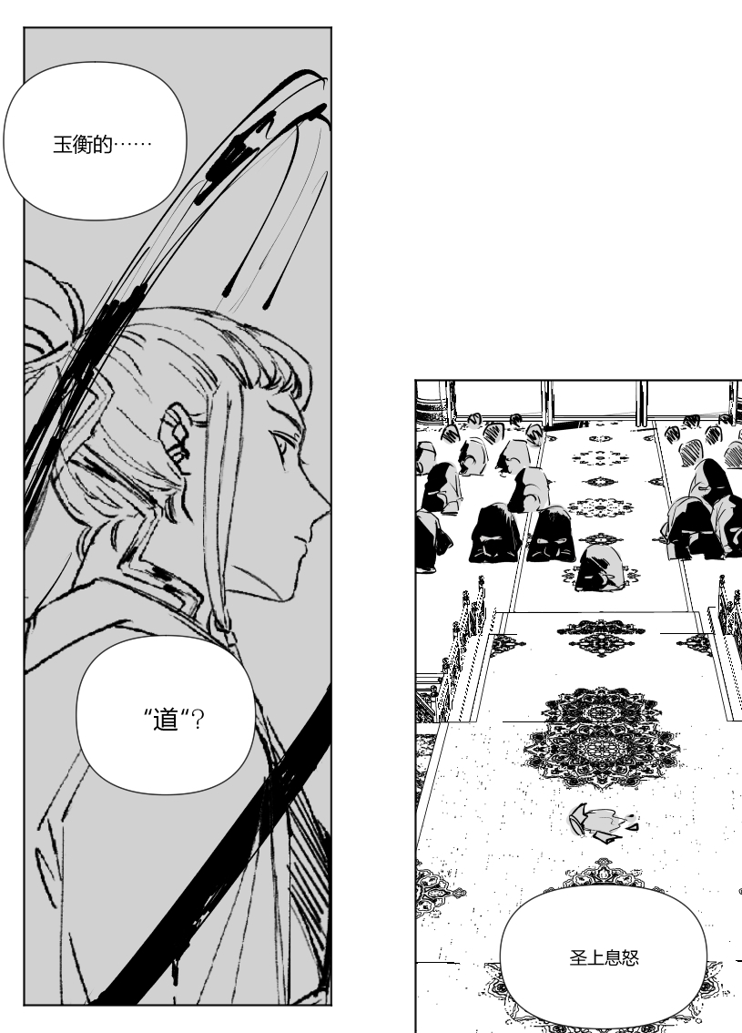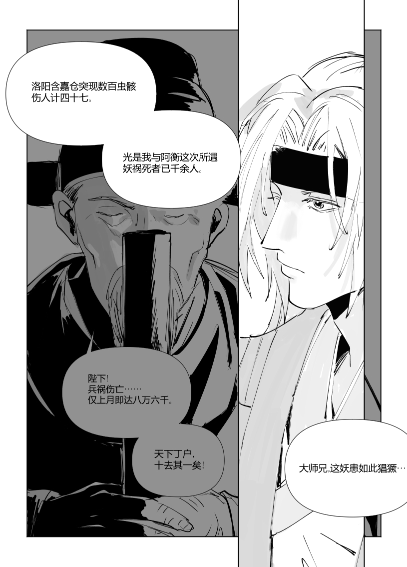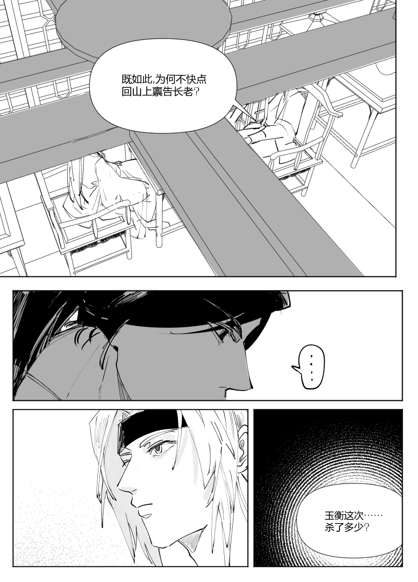 太强了,这才序章又出新的大漫画!很喜欢朝廷和二人对话交织的部分,非常有冲击力,以很一种有效的方式营造出一种山雨欲来的感觉。也期待玉衡这个角色后面剧情的发展,他作为这样一个有点跳脱门派戒律的人心中的“道”到底是什么,又会怎样影响他后续的行动