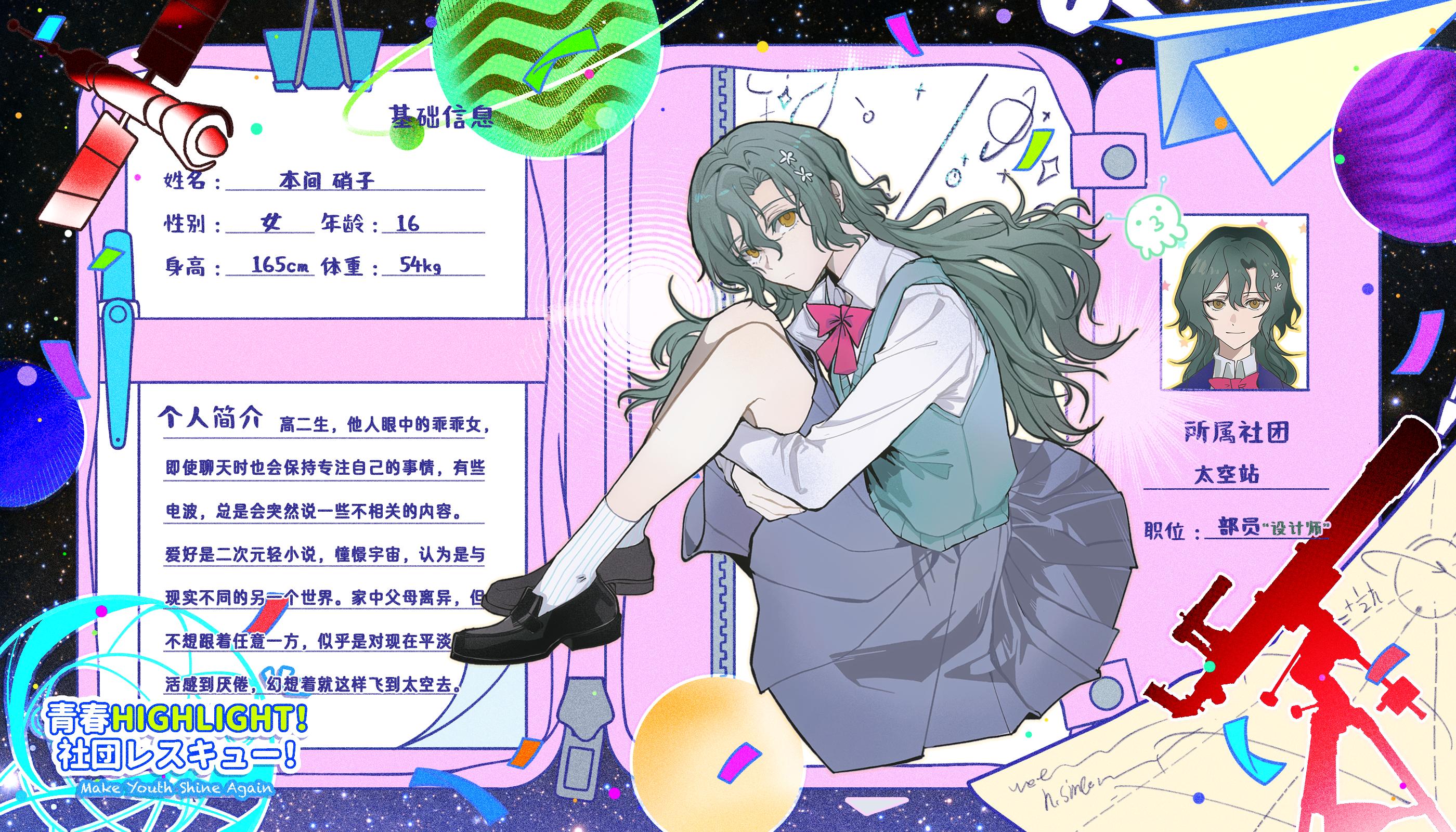 硝子我没记错有玻璃的意思,联想到透明无色融入宇宙的电波感好喜欢TT希望本间同学能开开心心的嘿嘿