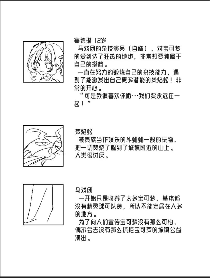焚焰蚣…焚焰蚣…超级贴合这个宝可梦名字的故事……感觉能嗅到郊外燃烧产生的烟气和烈火味儿…… 初遇的手上就是拿着鞭子……一定触发了不好的回忆吧……苗苗也辛苦了…… 图鉴上的知识运用得好到位,斗兽场的恶趣啊……这把火放得好。 旧时代里完全没有把控得,糟糕的人宝关系,终究还是给一些祈愿和谐相处的人留下了太多伤痕……焚焰蚣现在能和苗苗这么亲昵了好感动……你们要走得更远啊……