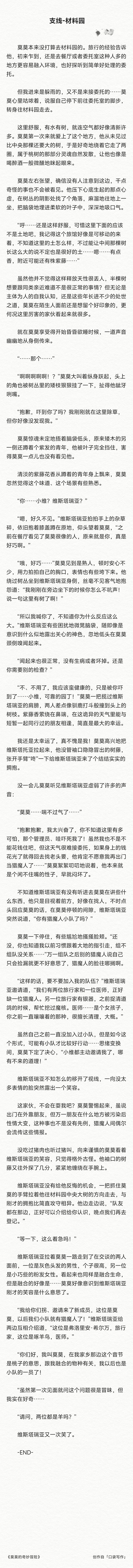 如果你在和树叶贴贴的时候闻到了紫藤香,那么最好看看是不是维斯塔瑞亚在附近。 莫莫如此忠告道。