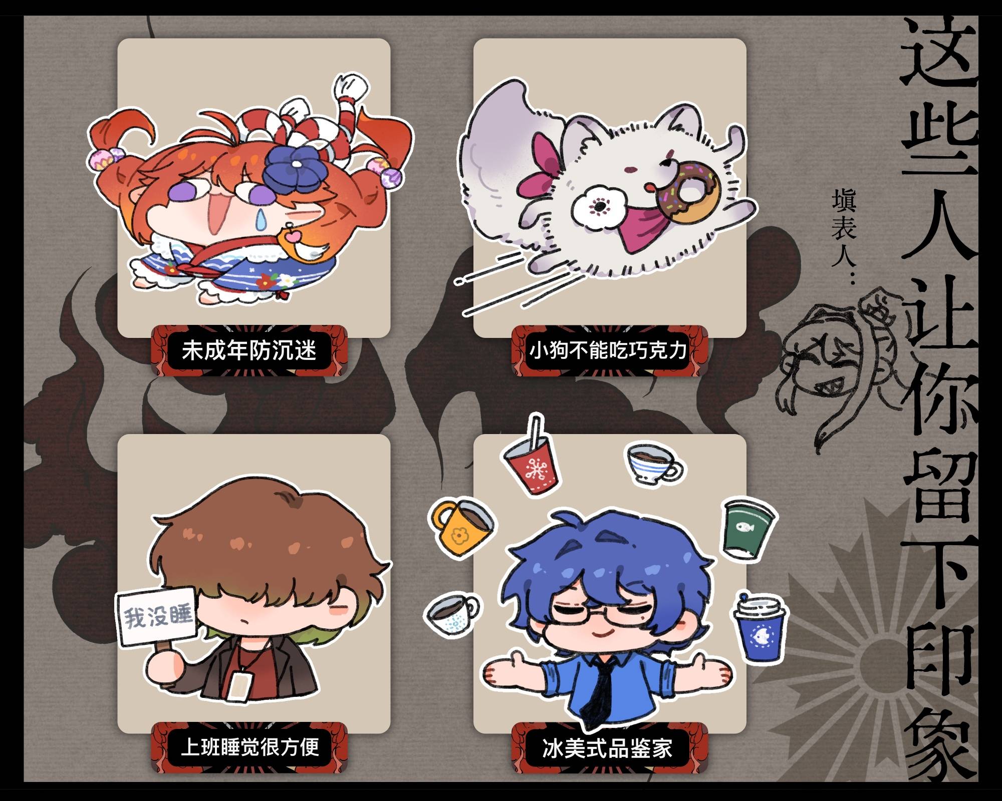 狗。。。可以吃巧克力。。(记笔记) 刘海遮脸可以上班睡觉。。。(记笔记) 喜欢喝咖啡。。那我给他加三倍量(记笔记) 给爱鸟配高配手机。。。(记笔记
