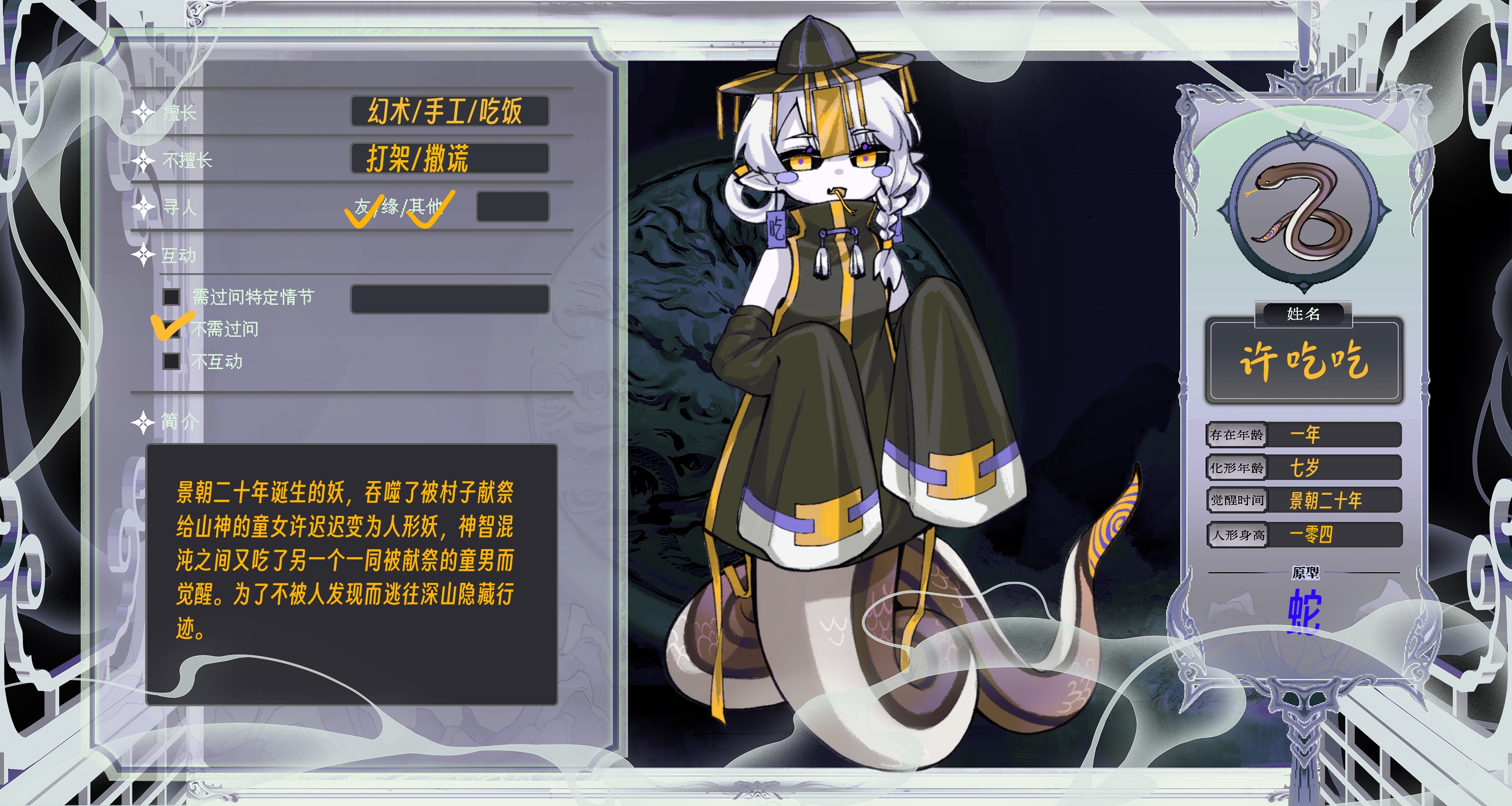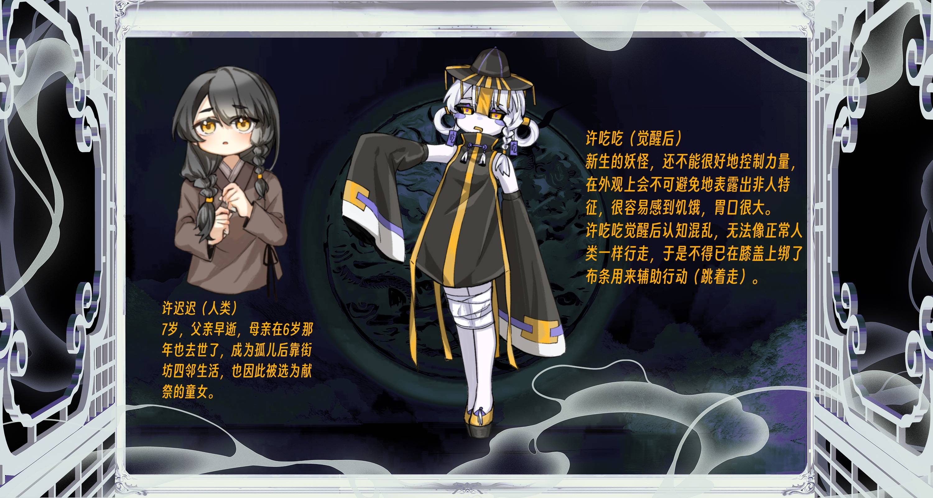 许家村有一个习俗,那就是每过三年就会将一对童男童女送与山神以祈求风调雨顺,三年后童男童女就会位列仙班,于是这里的人们都以此(送童男童女)为荣。 然而,其实山里根本没有山神,只是初代村长为了维护自己的威望而捏造出来了一个山神,童男童女被送到山里之后要么被活活饿死,要么被野兽吃掉,久而久之,山里便生了浊气。 景朝二十年,各地妖物伤人事件频发,许家村也不例外,虽然去岁已祭祀过山神,但为了祈求庇佑,村里决定再重开一次祭祀,而这一次便选上了许迟迟和另外一家的男童。 许迟迟与男童被村人敲锣打鼓送进山中的祭祀洞穴,多日过去,二人均已被饿的奄奄一息。强烈的求生欲望吸引了才诞生不久的蛇妖(浊气形态),蛇妖吞噬了离它最近的许迟迟,成为了人形妖,又因为饿了许久,本能地吃掉了身旁的男童,由此觉醒。 —————————————————————— 关于能力的介绍: 新生妖物,力量不强,目前只有幻术可以迷惑敌人,所以苦练幻术中。被许吃吃施展幻术后,会陷入“我是谁?我在哪?我要干什么?”的迷茫状态中,如果当事人三天都无法脱离这种状态,将直接失去之前的记忆。