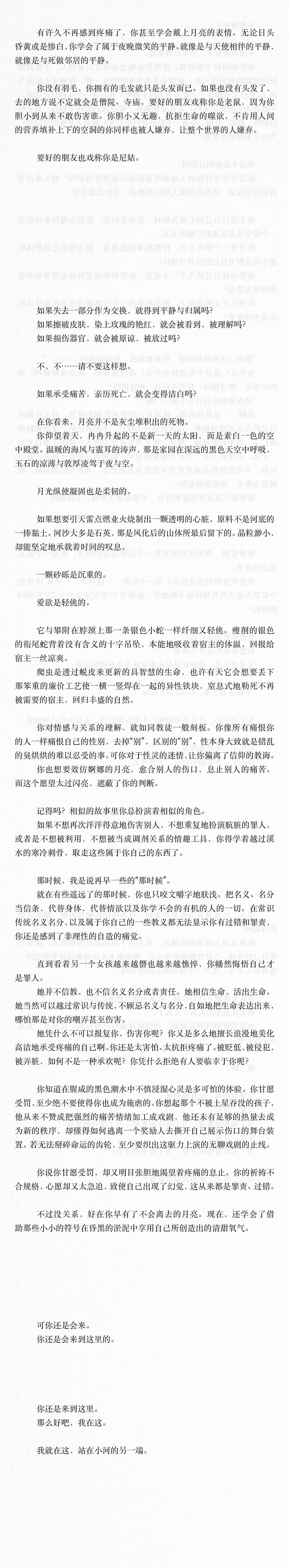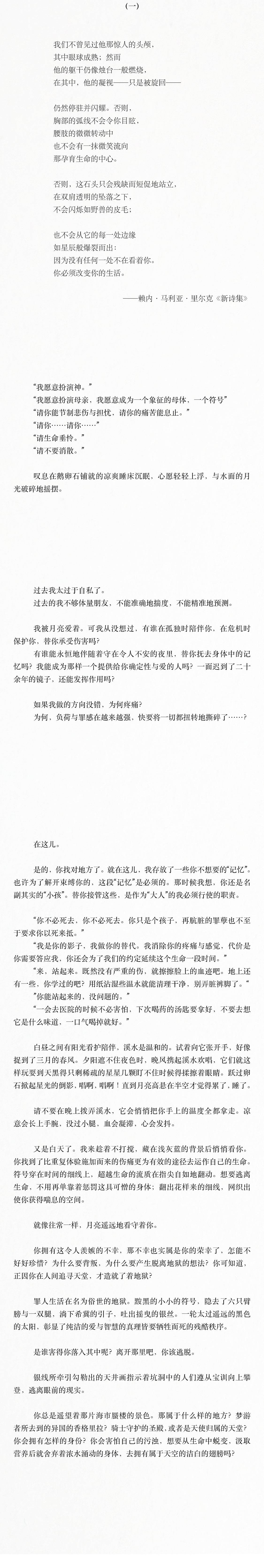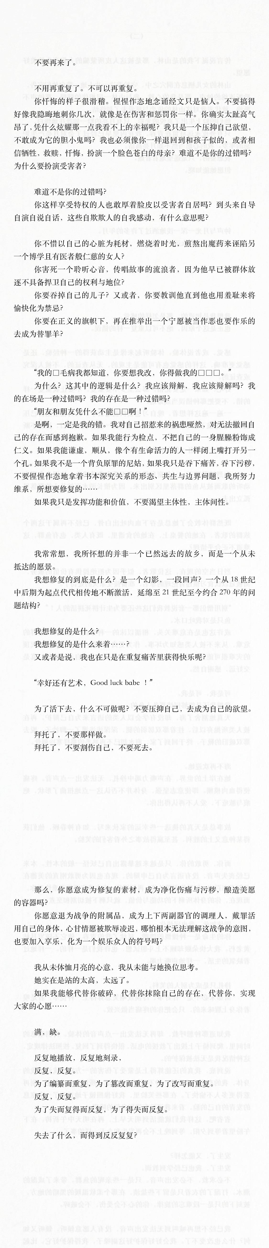 你是理想化客体,情绪的镜子。承担着解释和修复的责任。可是作为功能的你不再有营养可以供给,婴儿再次被抛弃。你可还有剩余的同情能去想象到,那些重复的痛苦与雷同的形式是在失去作为功能器官的你以后,剩下的维持叙事一致性的材料? 破碎的镜子,你宁愿打碎自己,也想要获得独立与完整。重演抛弃非你的意愿,施加暴力非你的专长。最后你所能负责的,或许只剩坚定地回到主体位。