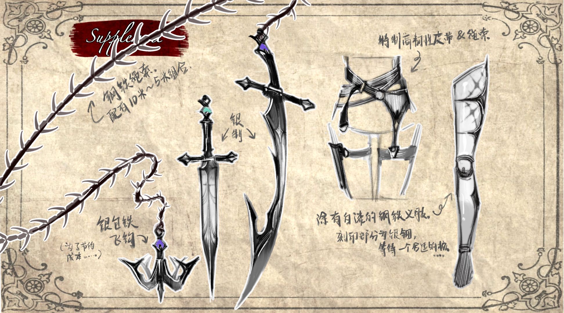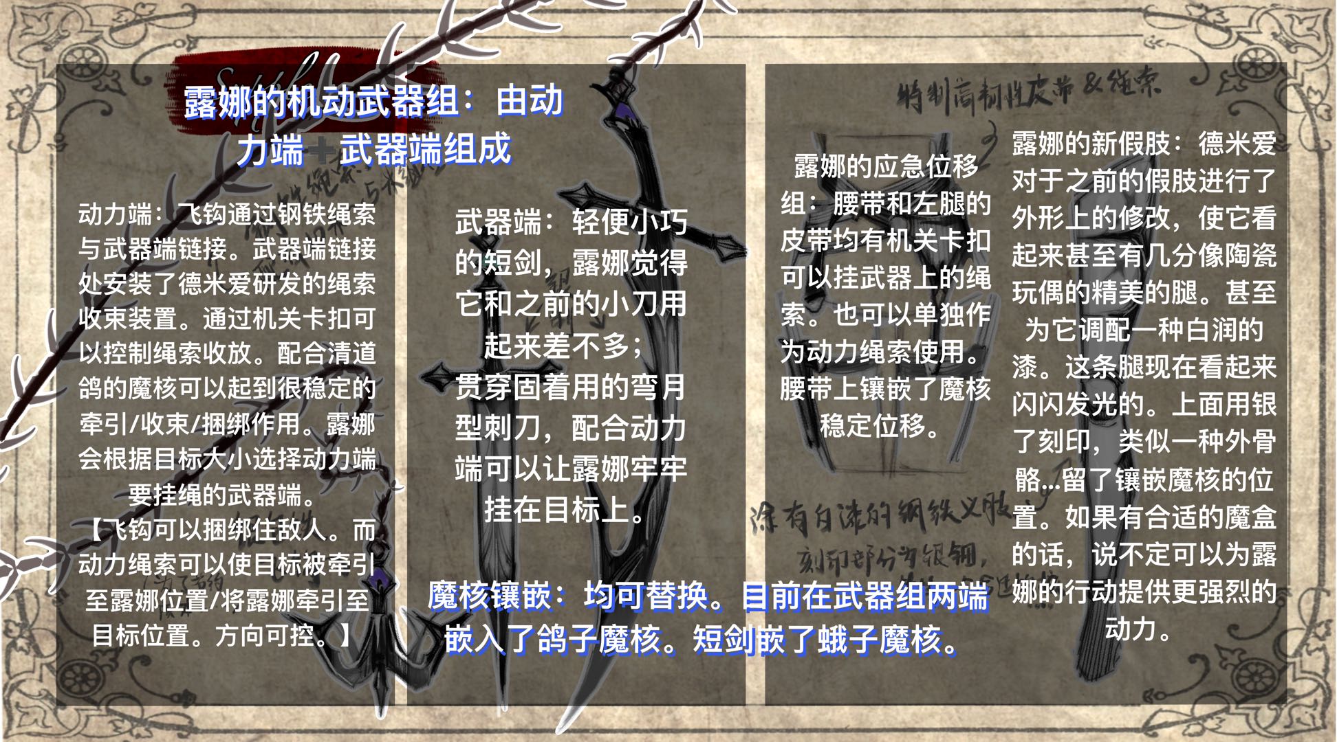 出于对第一次外勤之失败的深刻反思,露娜在身上绑满了动力组,也同样奢侈地打造了更致命的武器。。。 她甚至开始觉得自己更像一位猎魔人,而非游吟诗人了…!老天爷这太吓人了。她从未想过自己有一天会将战斗而非歌唱作为主业。(不过她也并不认为自己的战斗能力够格就是了) 于是,陪伴她最久的那把小刀仍然被她携带在右腿的老位置,算是她的一点纪念。 至于那精致得不像话的义肢,,, “德米。。。没必要这么精心涂装义肢的,这种漆在战斗以后肯定会磕坏的啦!? 会碎得不成样子的…那多可惜阿!” “没事的!碎了再涂嘛!”