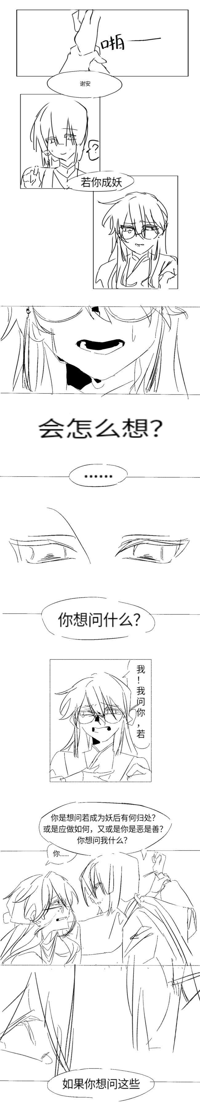 哇哇好美味的二人相谈!神态描写太棒了ww最后1p有种跳脱出自身轻飘飘俯瞰人妖纠纷的漠然感……谢师兄鬼鬼的闻人师兄已急哭(误)啃在一起说不定就解决问题了呢!(爽朗)(拍手)(x)