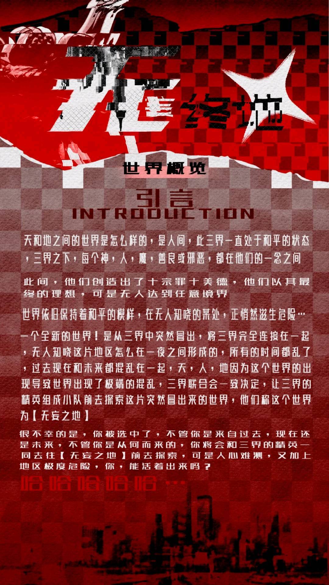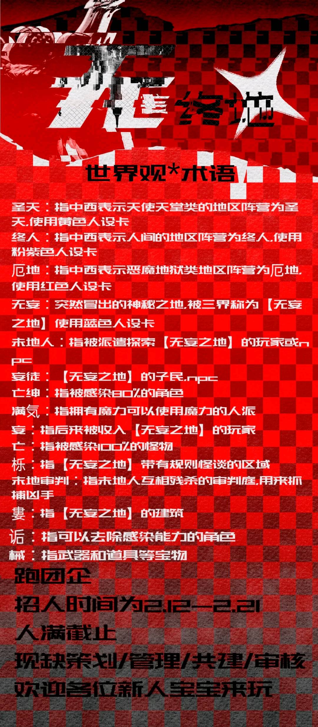 『企划宣传』无妄终地:来自前者的日记 规则怪谈/剧本杀/狼人杀/抽卡/探索 /无限流 /文画/中审/微强制打卡主线/强制组队 /可落地锁/跑团/选择性撕卡 招企划/管理/共建/审核 求求孩子急急急 ❈——————————————————❈ 这个世界需要重启 成为单调性质的一切 没有人性的难测 也没有世界的混乱 美好,来自无端的妄想 ❈——————————————————❈ 企划简介: 企划不强制组队,但主线需要组成5-10人小队才能进行探索,没有组队的玩家只能作为后勤人员出现(仅在复活点出现),且不能获得事件卡以及主线卡 在本次企划主线中,玩家将会前去无妄之地,在无妄之地中进行探索,探索一切的真相 p2企划简介 p3p4企划须知 p5世界观和术语 开企日期2.12截止到2.21