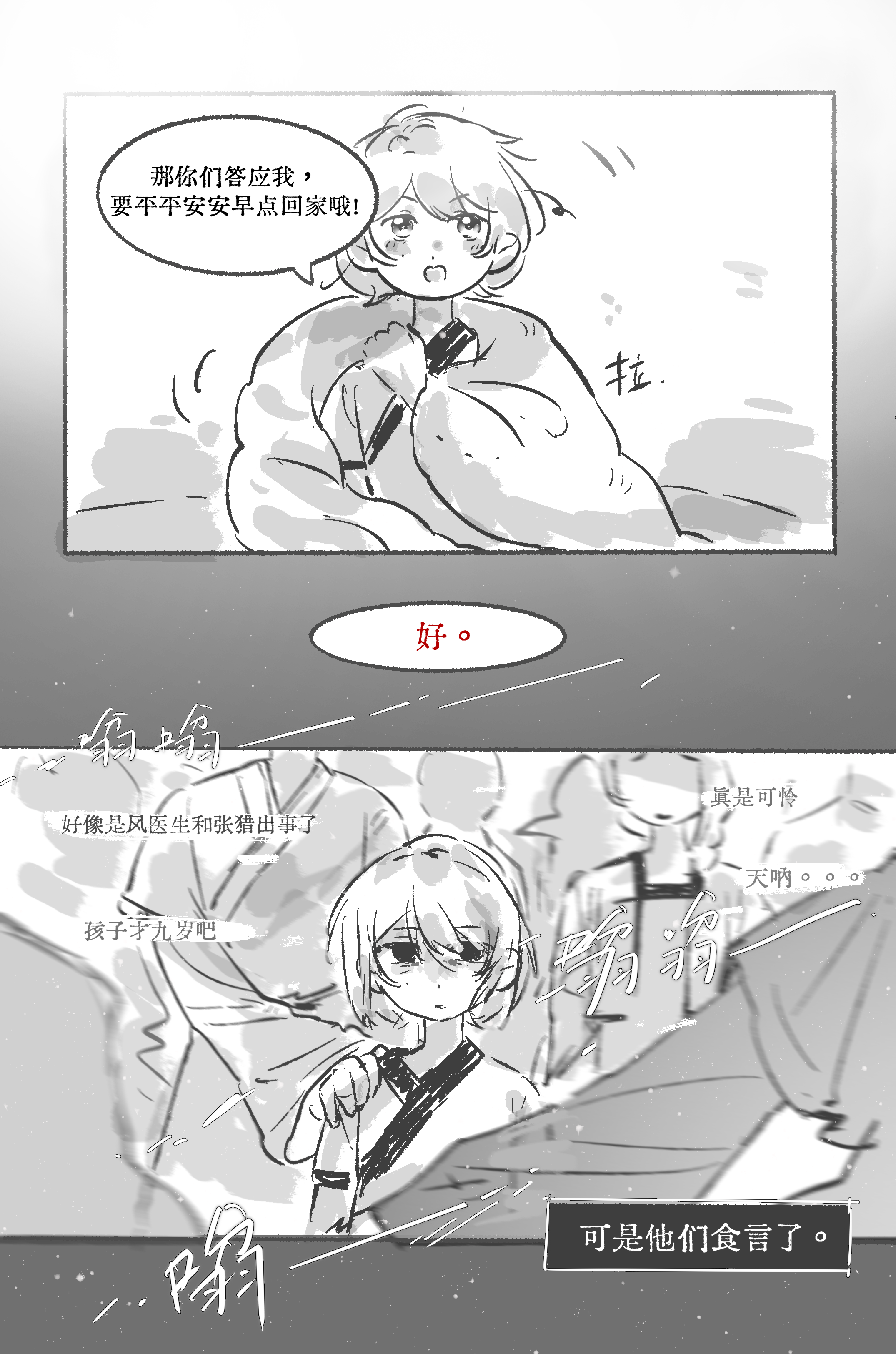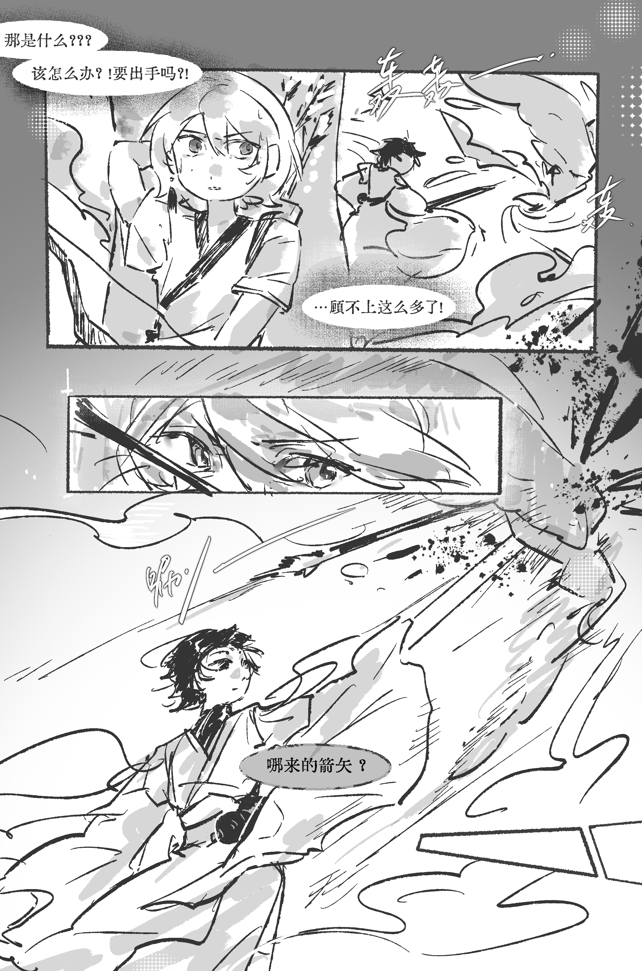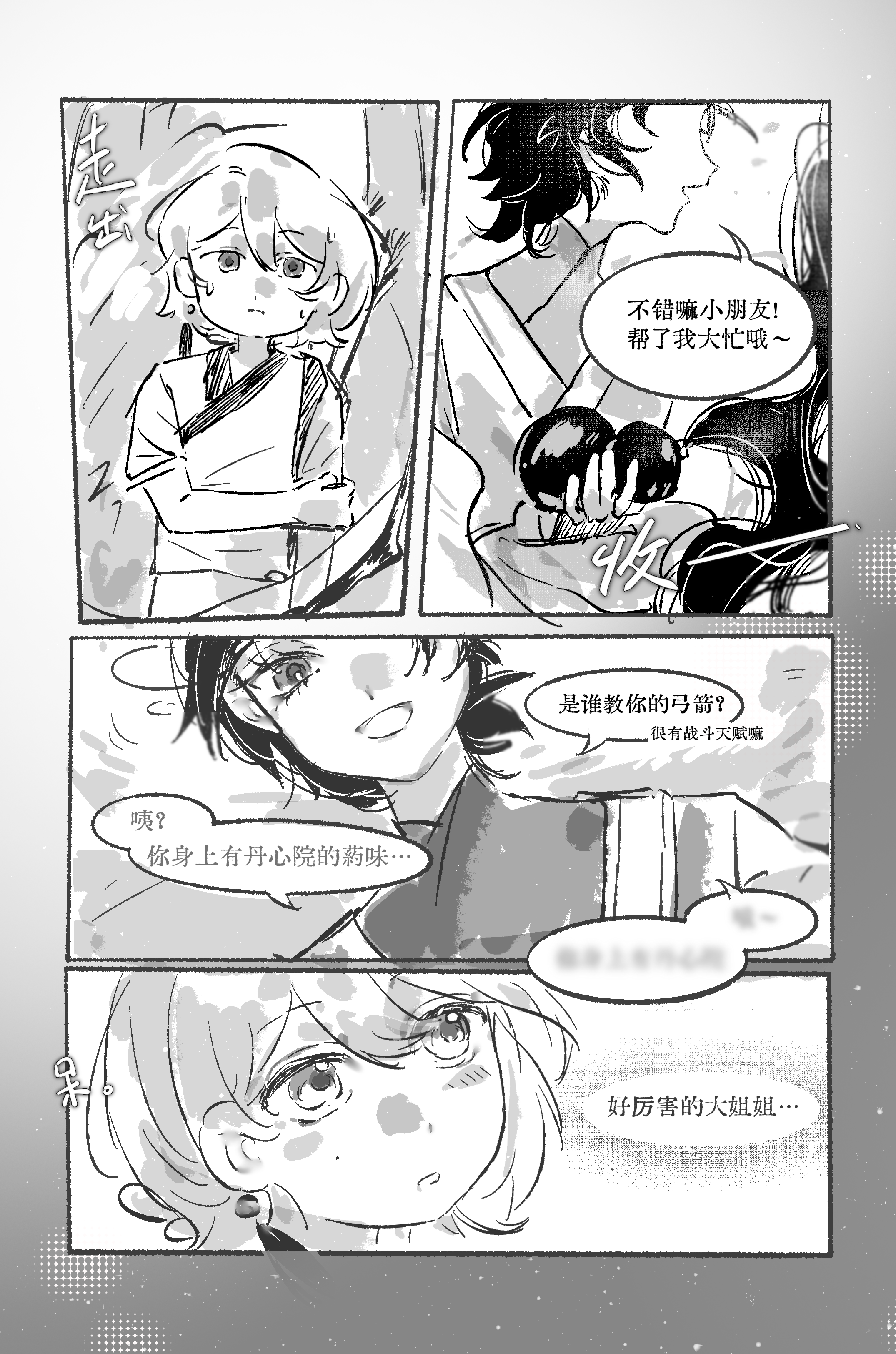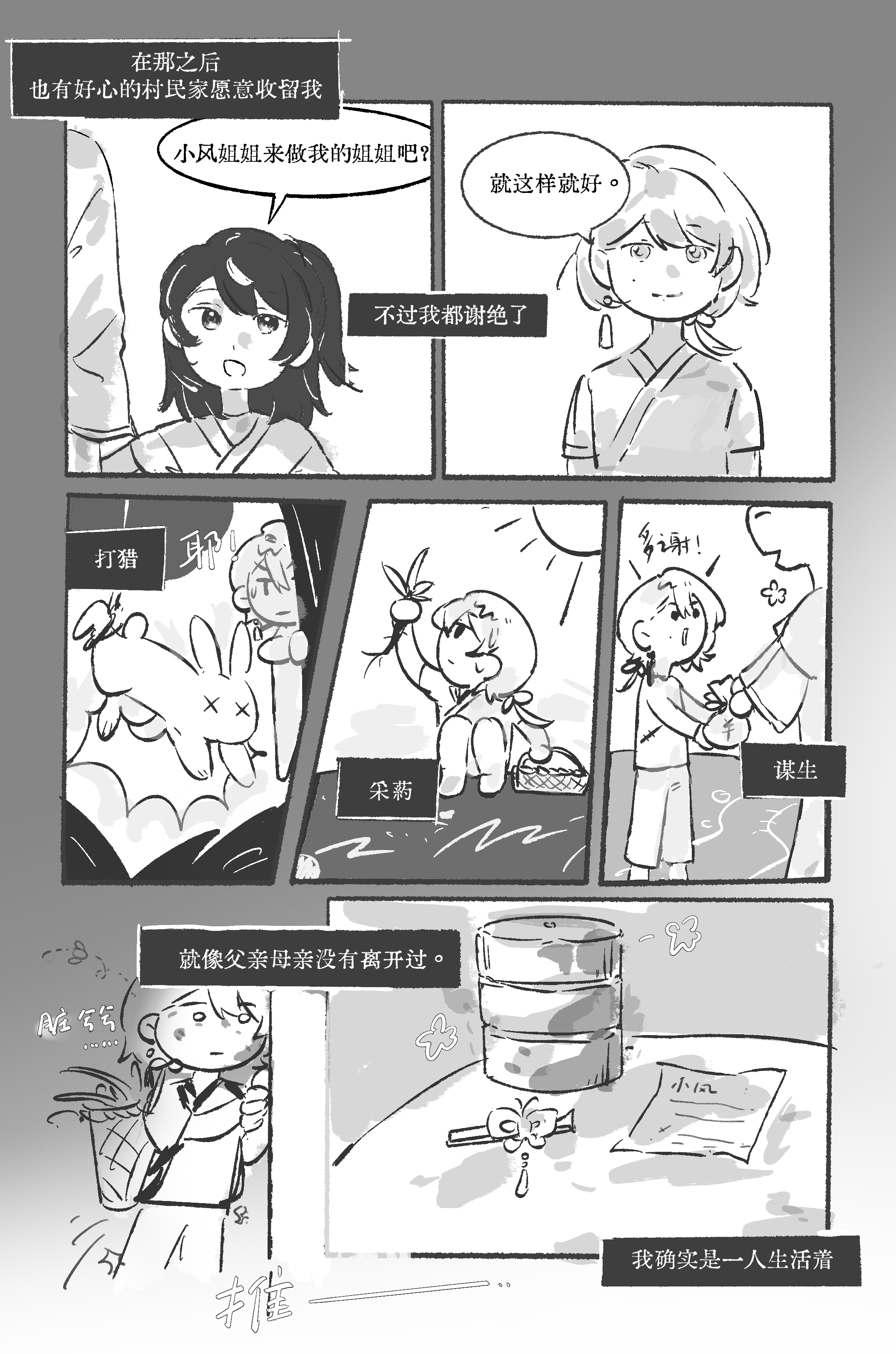 怎么有人现在才打卡序章(擦汗),画了风暄上山前的故事,可以瞥见父母爱情的一角。 *第一次画黑白页漫,能力不足,问题很多TT,删删改改了很多。比如还想多画一些小风独自生活成长的画面;想借应山弟子之口,给小风更全面地介绍各院长老们;想多造谣一些同期生的青涩过往…但总算是完成了,有机会再画(尤其是长老们和同期生)!!♪(* ´з)(ε` *) *分镜有大量参考学习 *特别感谢锈师 刺刺和十七 ?,爱无需多言…也特别感谢所有带小风玩的企友老师!!❤️(我尽量尽快回互动´༥`) *其实序章中的神秘应山弟子,本是想邀请入门年份大的企友来互动的。但中之人实在是拖延和爱你在心口难开,只好捏造了一次性的神秘npc——所以大家如果有剧情角色需要的话,欢迎小窗口嗨!!(没有也欢迎)