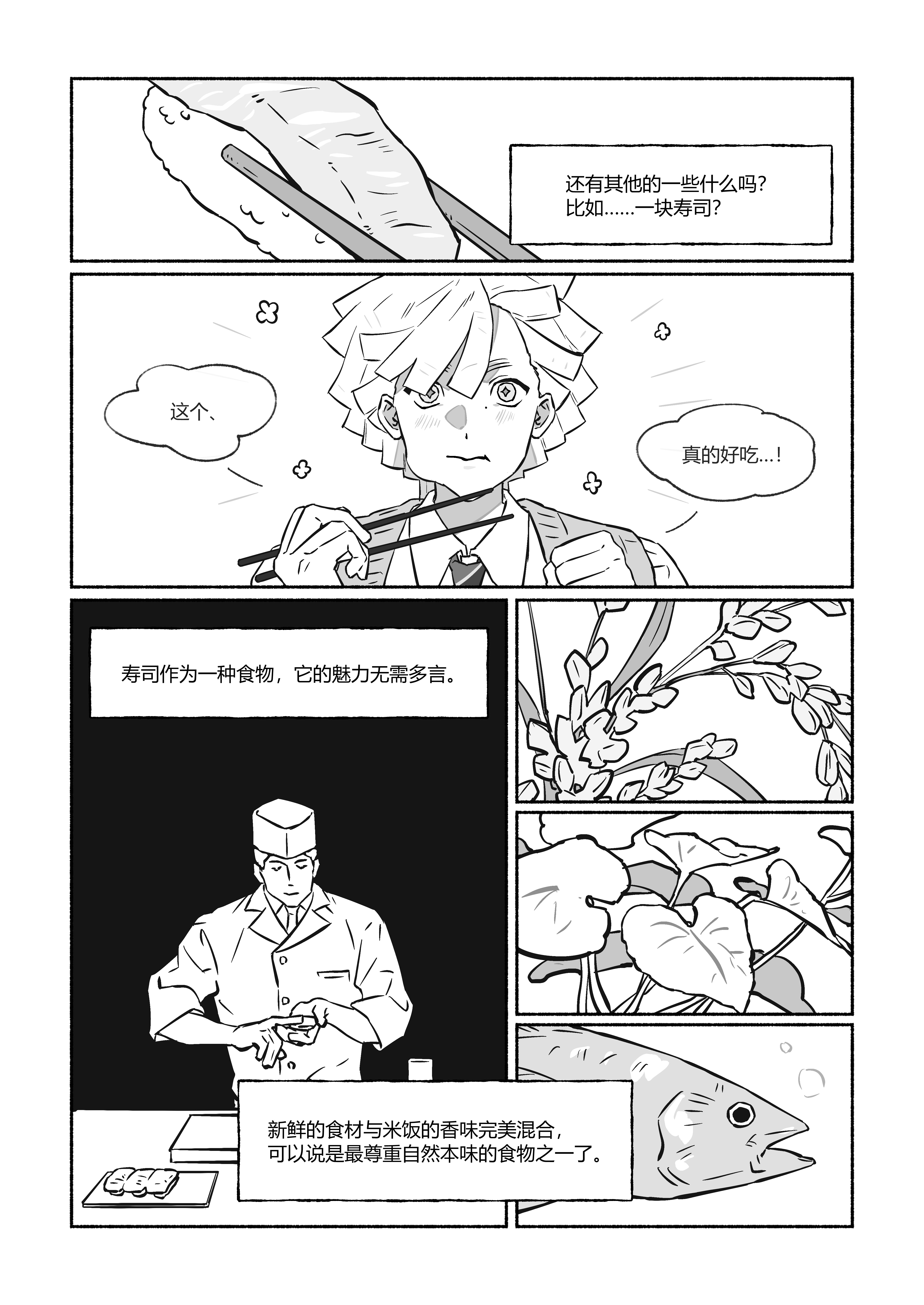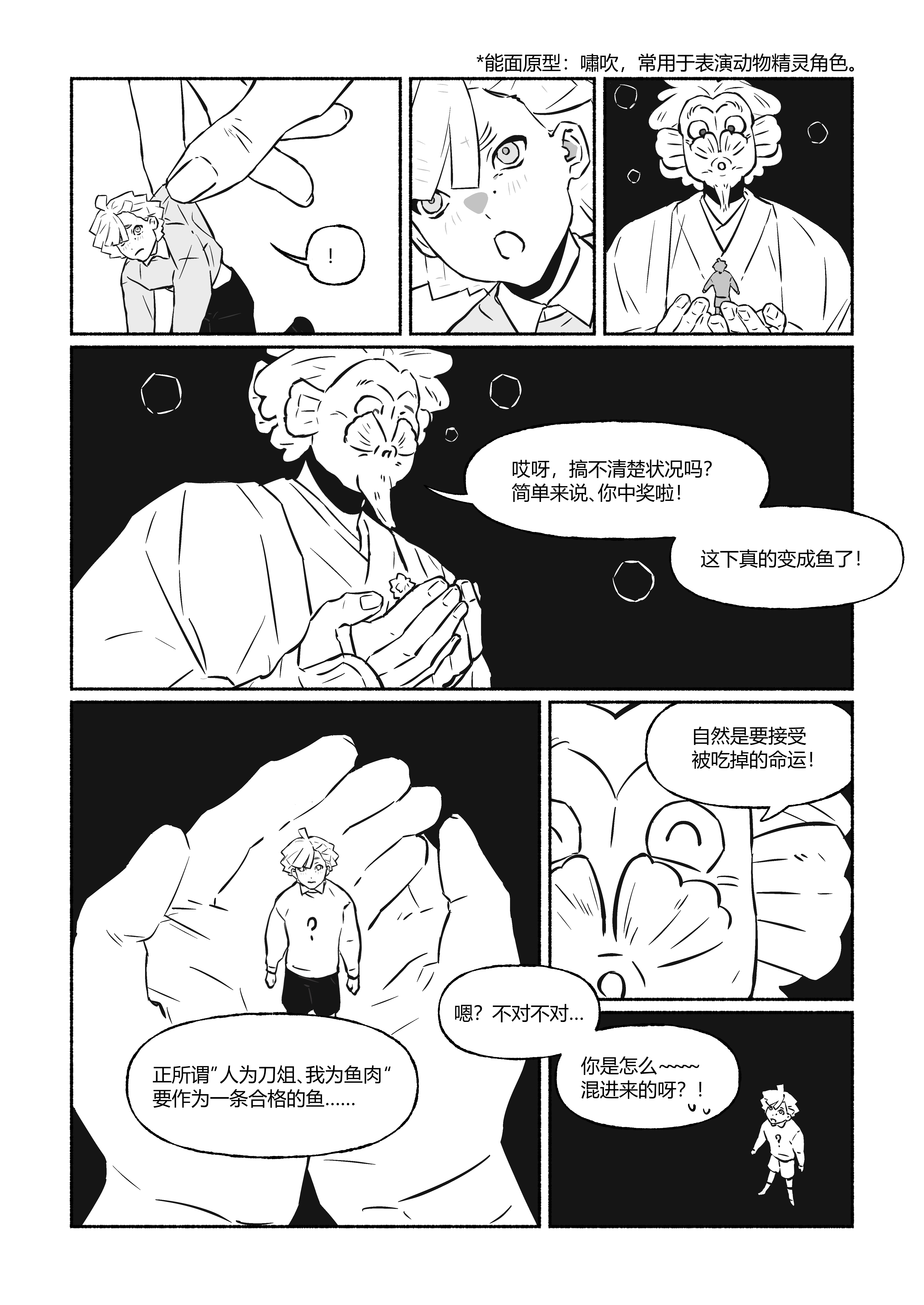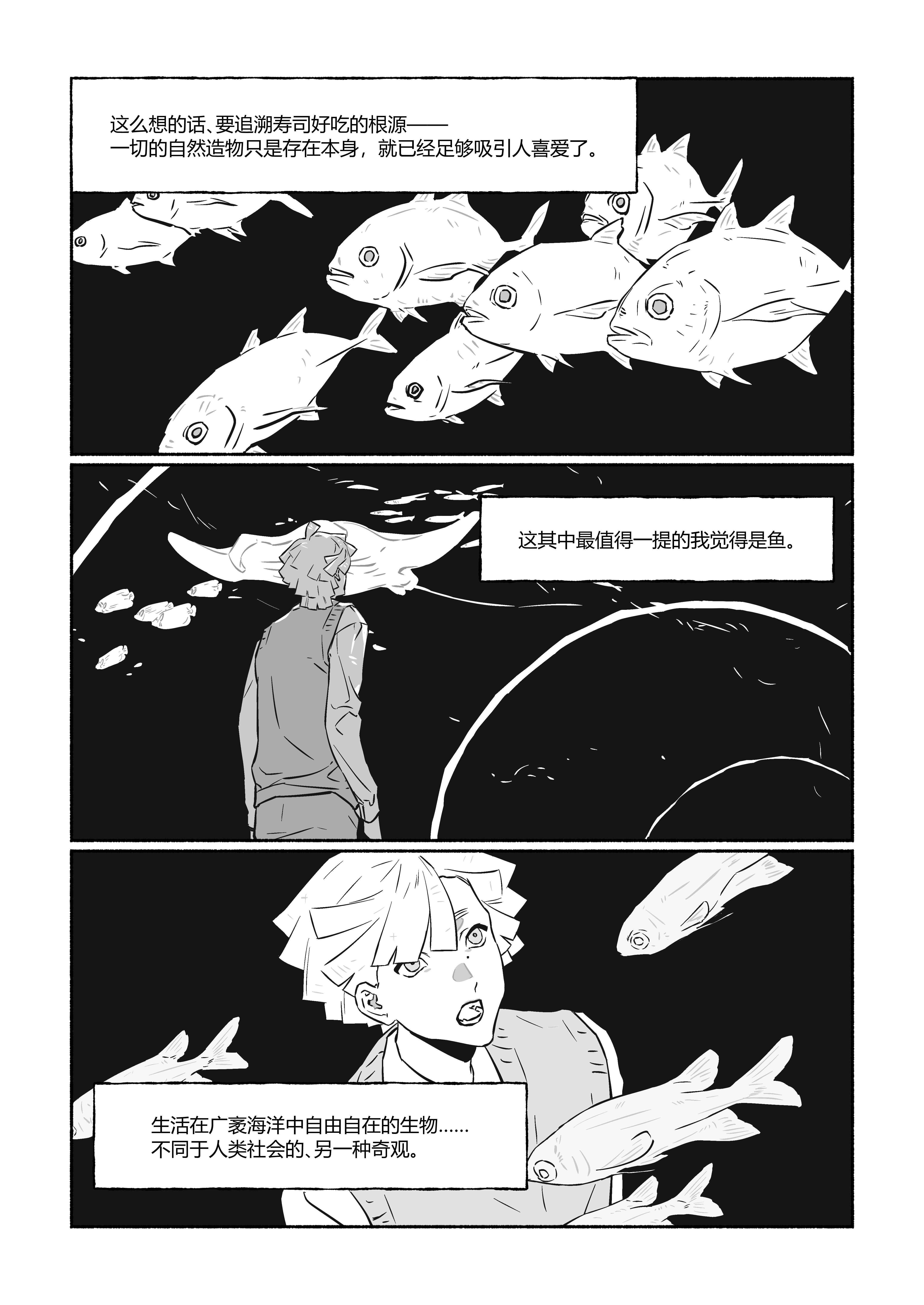 好舒服的笔触呀好喜欢!由寿司引申到鱼也有种四肢重新粘合成完整人形的感觉……能面好像荒诞的梦境……变成一条小鱼化成了食物链上的一部分,要努力证明自己值得被吃掉也好有趣………