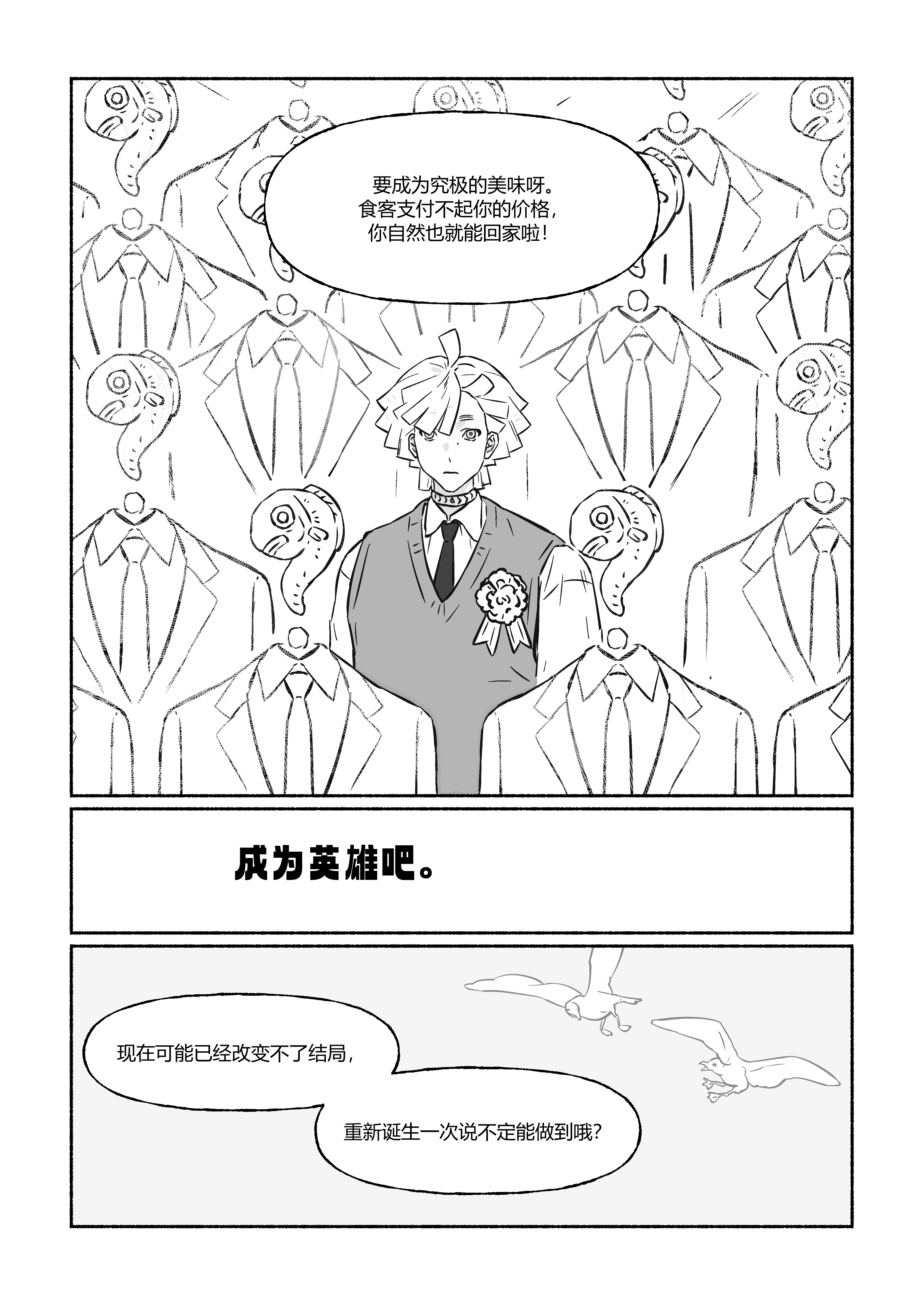 噢噢噢哦哦好对我电波的解释!!成为鱼就能很快的忘记刚刚的事,但成为鱼自由自在,被捕上来、被杀掉做成菜也并非自己能够决定的事……!!不管是鱼还是人都会遭遇这种突发的巨大霉运只是人会思考很多[原来一也你才是那个随便吧爱咋咋地的[不如说是看起来放弃思考了],没事的,即使是真的要被杀了你也会是好吃的鱼,我会好好品尝烹饪[努力活命]的过程的