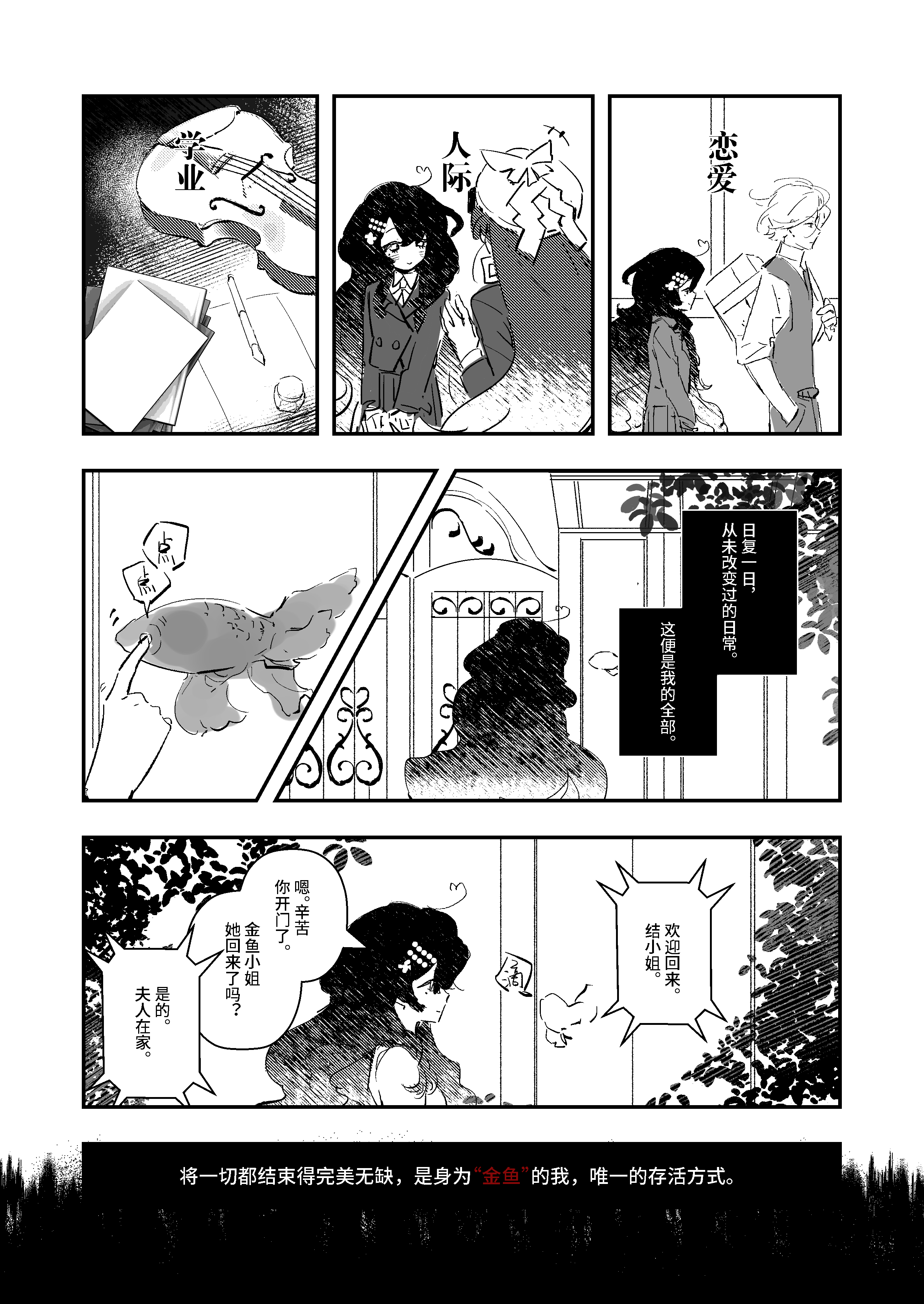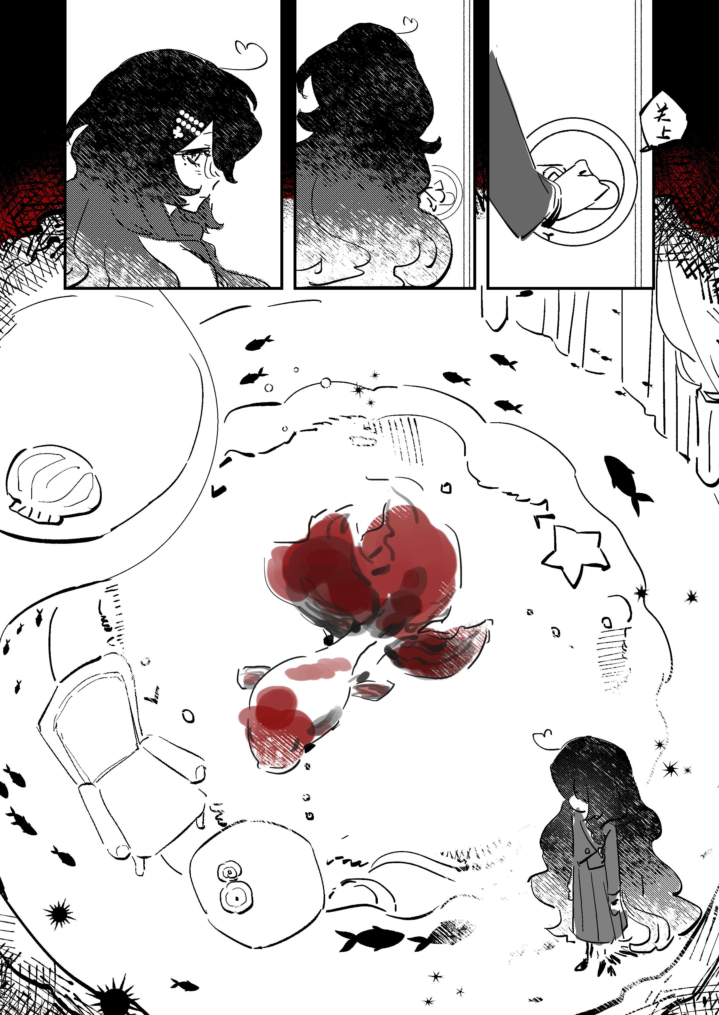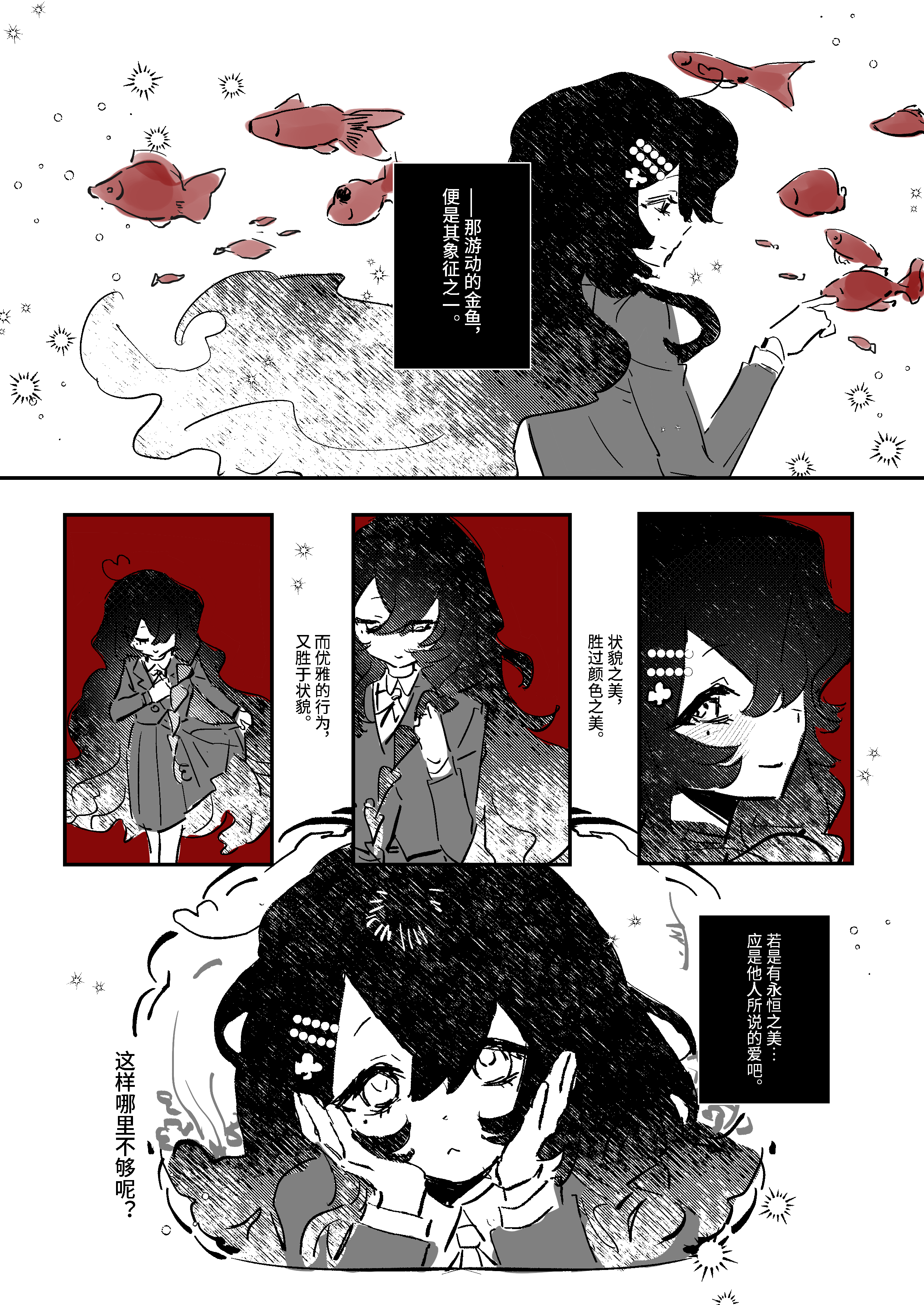 黑白红的构成把握太漂亮了吧!!??? 门铃也是鱼呀好可爱… 能隐隐感到到 母亲更关注完美的“完”,而金鱼同学则更关注完美的“美”呢。明明这样厌恶丑陋的暴力却进入了bl……好想看金鱼同学在bl中展现生命之美…!