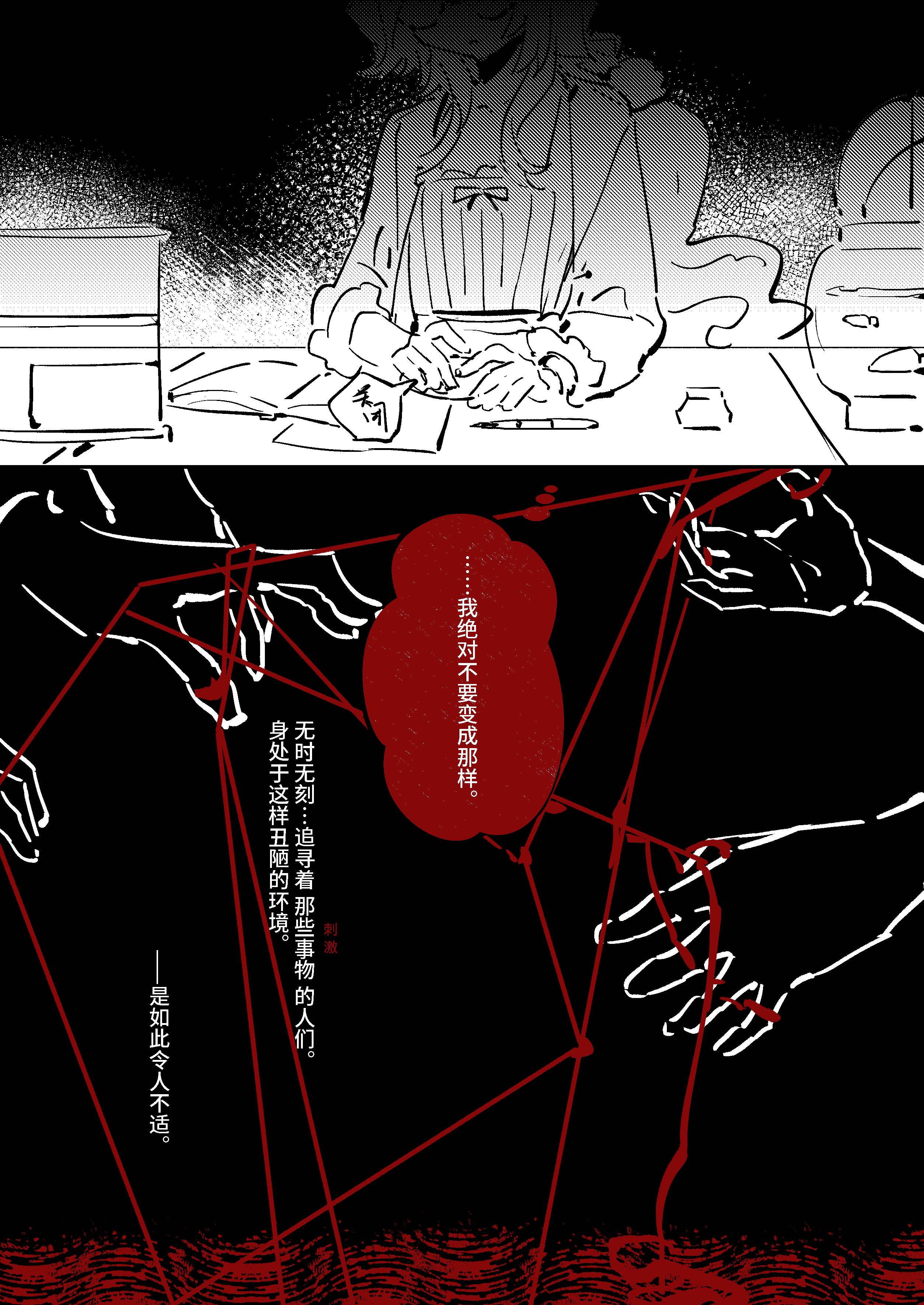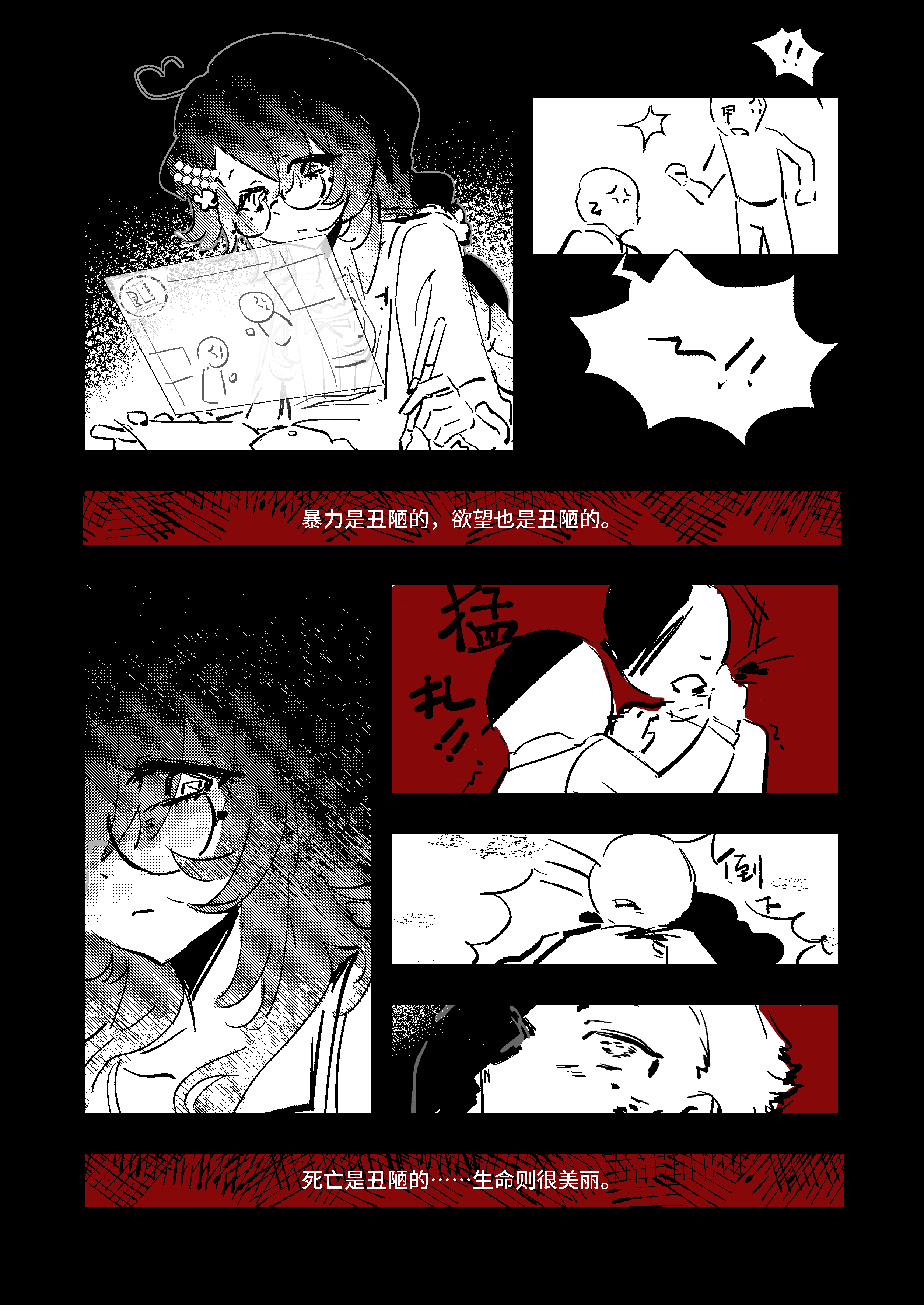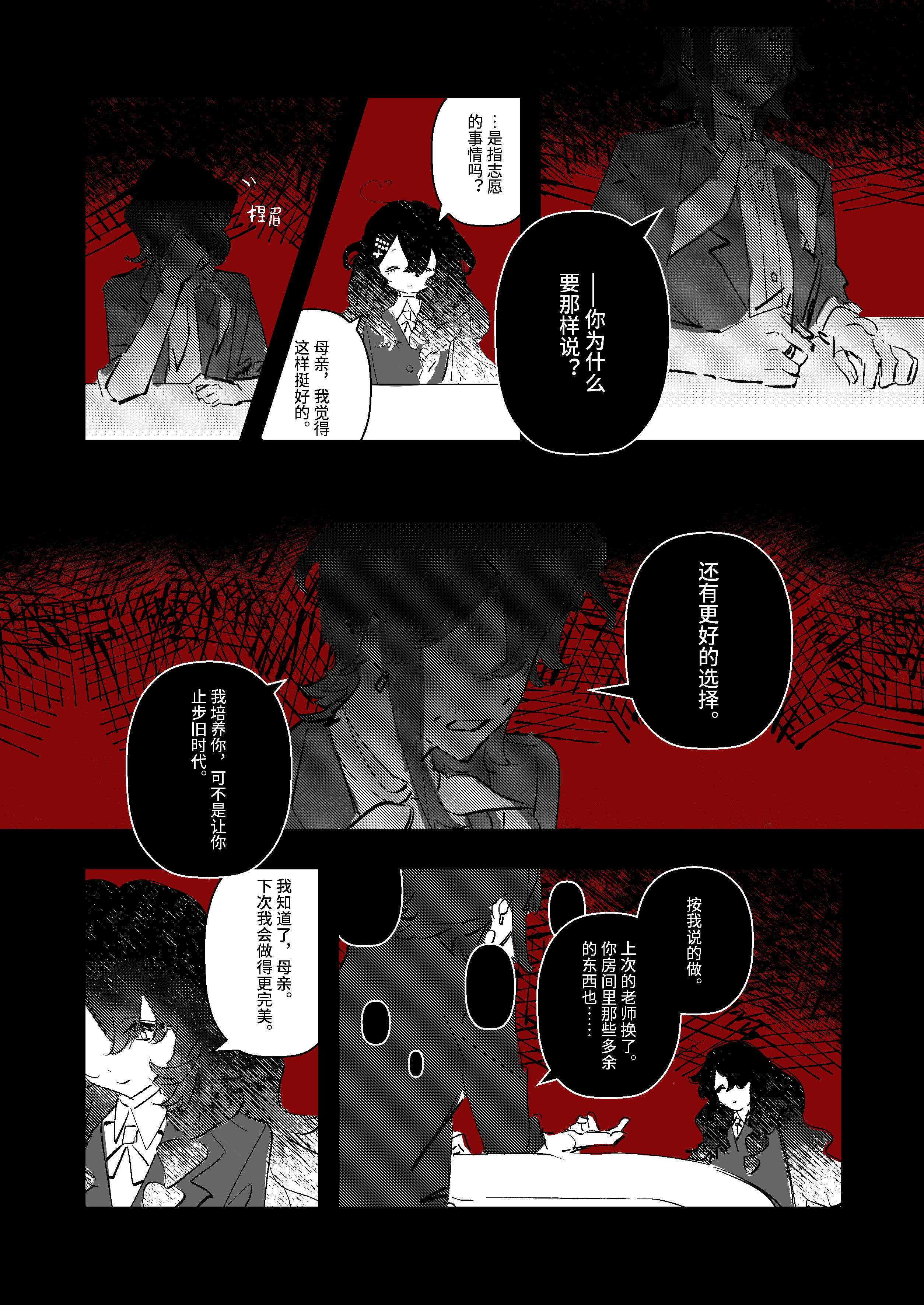 黑白红的构成把握太漂亮了吧!!??? 门铃也是鱼呀好可爱… 能隐隐感到到 母亲更关注完美的“完”,而金鱼同学则更关注完美的“美”呢。明明这样厌恶丑陋的暴力却进入了bl……好想看金鱼同学在bl中展现生命之美…!