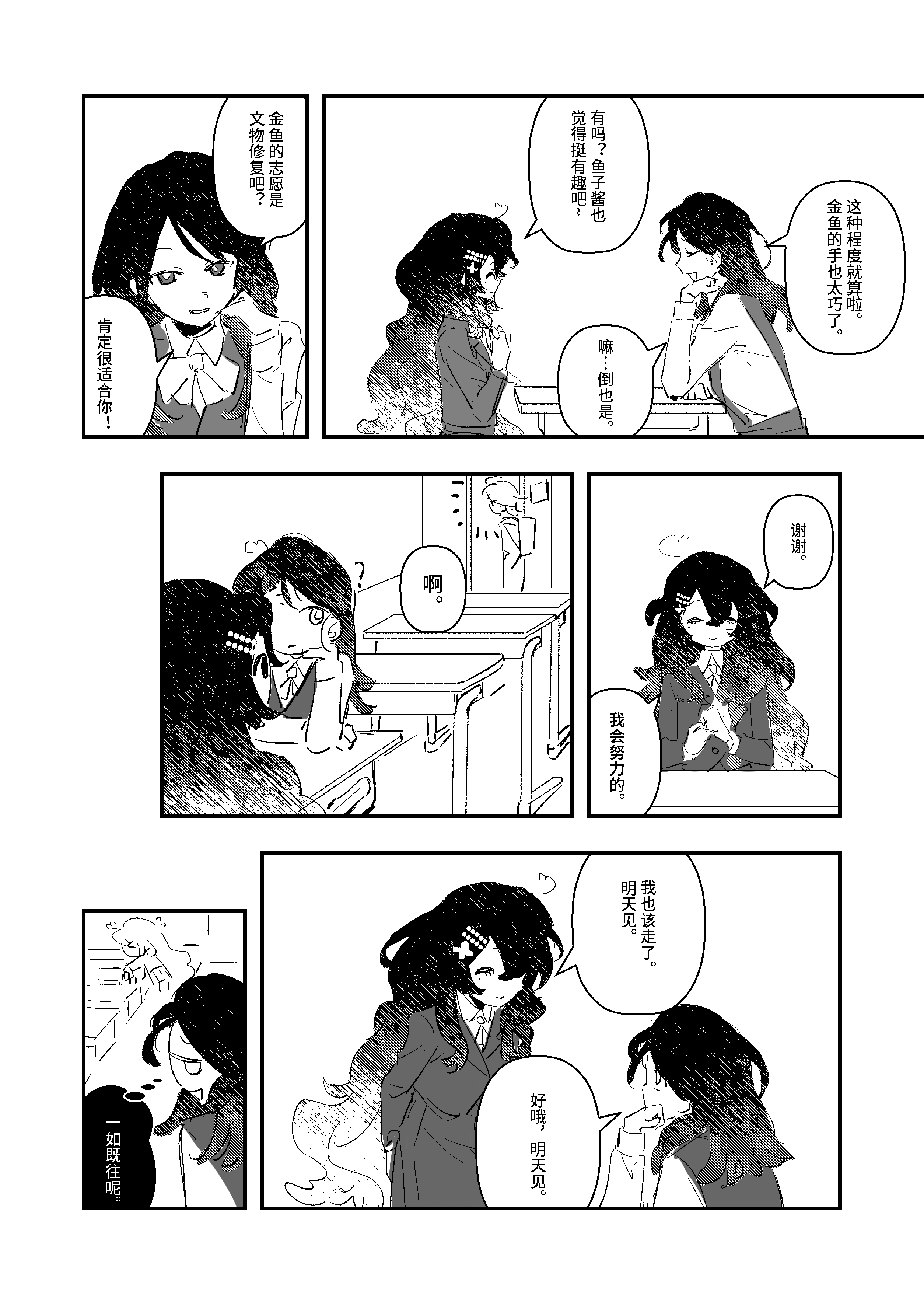原本很好奇这个孩子比较固化的观念是一种怎样的设定,从剧情上能感受到的是一种压抑,或许这一套理念是被环境强加的吗?她虽然思维顺从了金鱼的美,但看起来对于作为金鱼这件事其实感受到的是一种被物化的压力。很期待之后的展开。