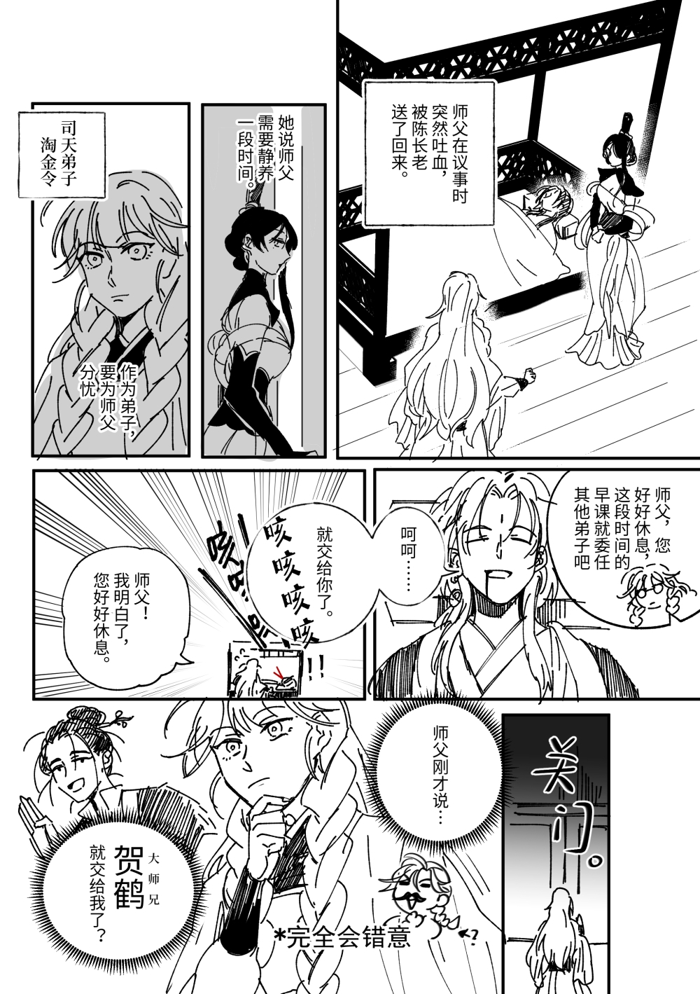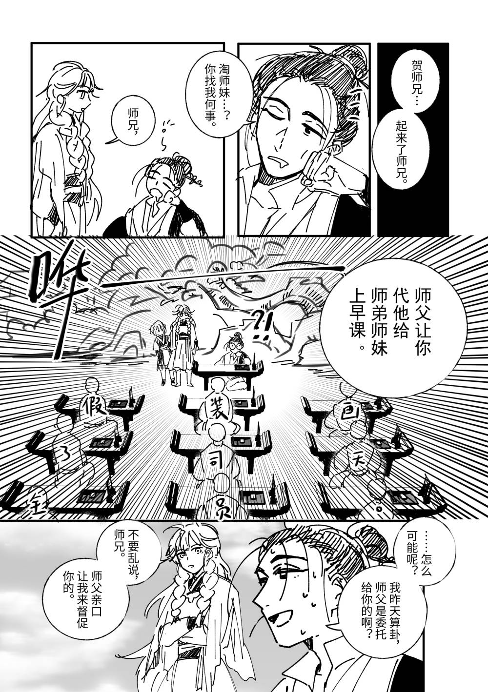 最喜欢谐音梗了无敌好笑!弱小无足呵呵师兄,居然还提前算卦看代课安排,最爱看这种努力偷懒人被冷面搞笑役害得闲不下来的剧情了。话说贺鹤师兄居然被搬到讲台、卸了腿还没醒,令人羡慕的睡眠质量(?)