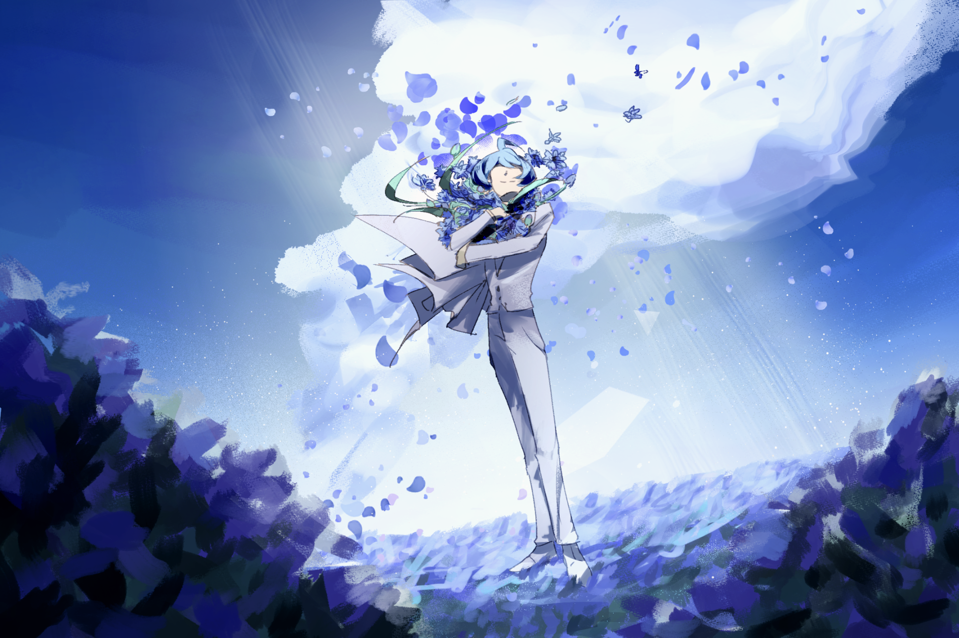恭喜春晚! ①这次因为想加入温柔的元素所以用了花 虽然根本看不出来我也没画但我觉得班长很搭蓝色矢车菊 花语之一是“遇见幸福”,感觉有点契合班长来到3c之后的情感变化(?) ②死e站为什么我们班长的春晚撤这么快我不会原谅你?