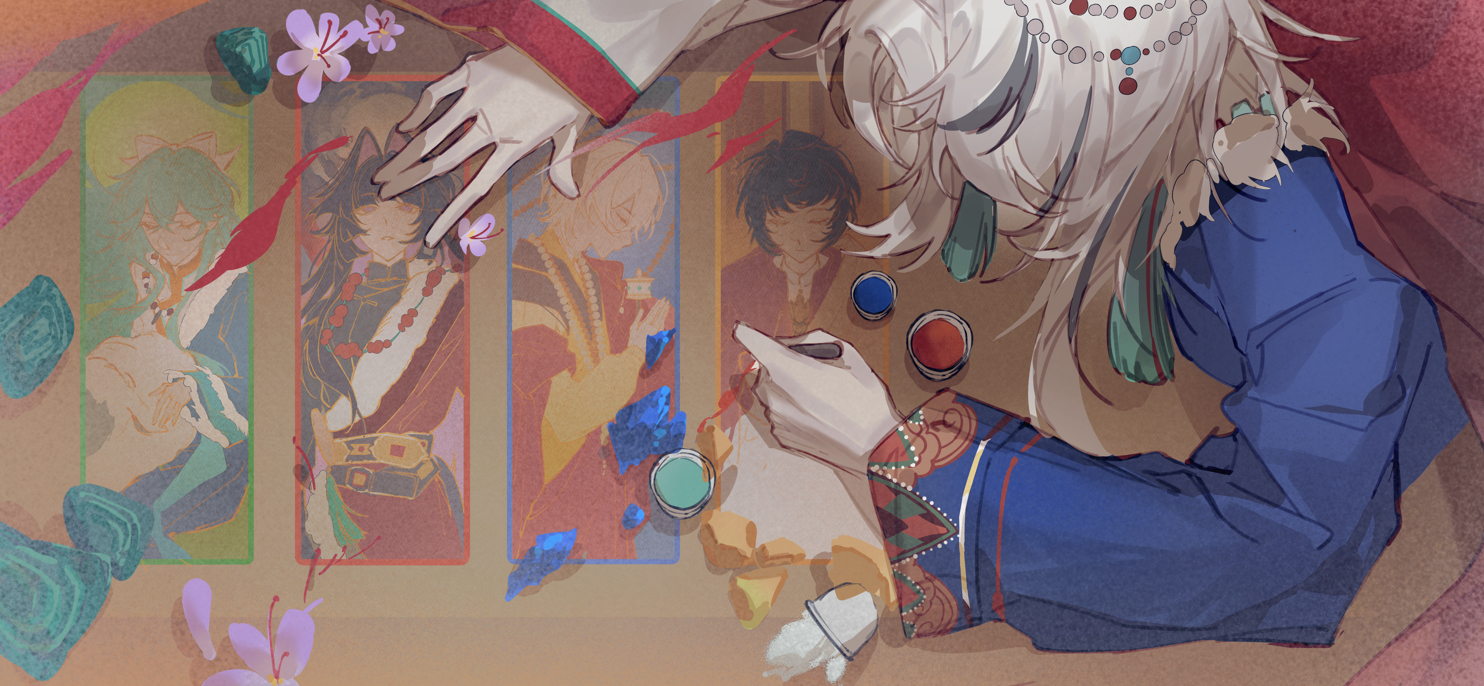 何等……何等的强大啊……把剧情和背后的设定都完美融合了……大家从经幡的五色中背负自己的使命来到人世,画师用五色颜料将所有人描绘……好有意境的图!!能吃到这个一定是上辈子好事做尽的福报啊啊啊啊啊啊