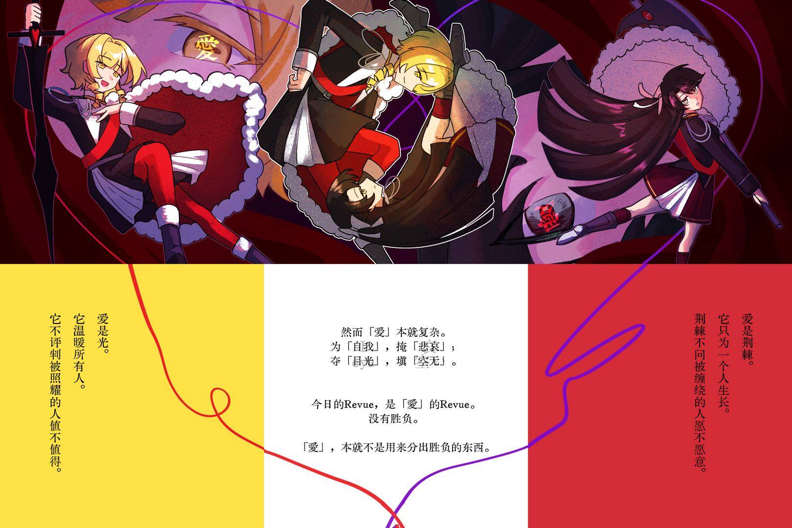 共演者:上原野玫瑰&灰原楼沙 あたしが愛を語るのなら その眼には如何、映像る? 若要由我来谈论爱的话、在那双眼中映出的又是何等景象? 詞は有り余るばかり 無垢の音が流れてく, 言辞都是过剩多余 无垢的音色流动而去, あなたが愛に塗れるまで その色は幻だ, 在你被爱涂满之前 那景色也不过是幻想, ひとりぼっち、音に呑まれれば 全世界共通の快楽さ, 一个人孤单地就此被音乐吞没 这是世界共通的快乐吧。