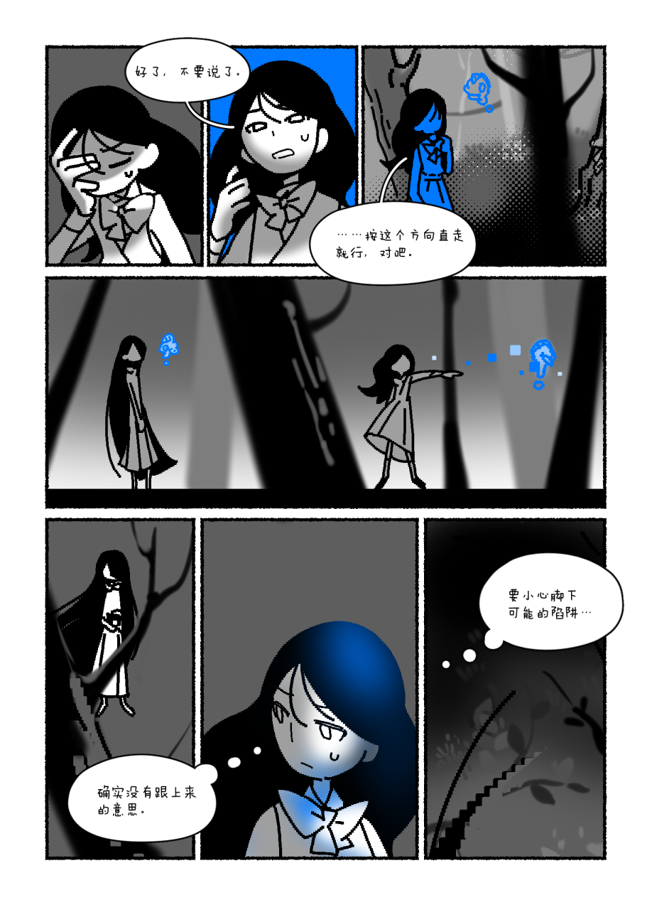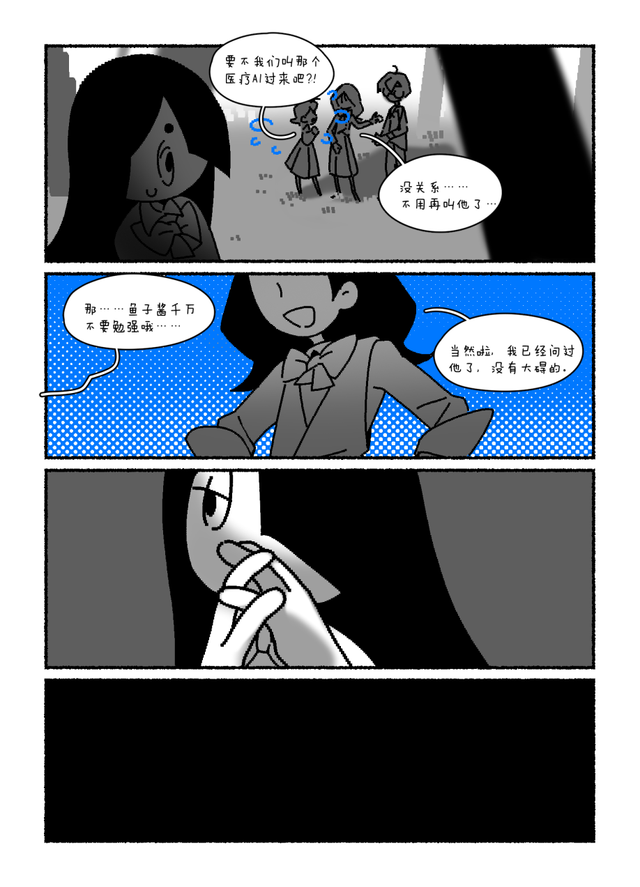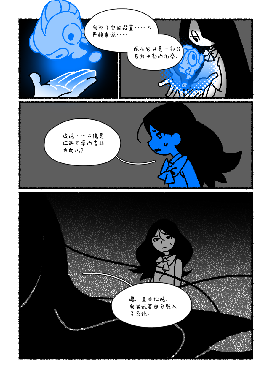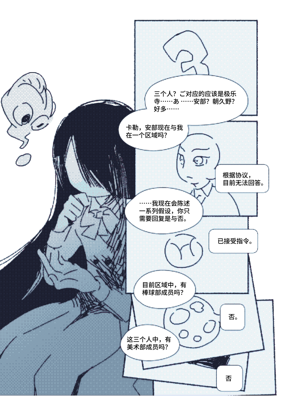 哇,特别喜欢仁科同学对每个人的绘制与刻画,很简单的线条但是把每个人的气质和特点都抓的特别好…好喜欢你画的卡勒,那种出现在黑白漫画里独特的蓝色真是很美丽… 没想到仁科居然是从一开始就计算到的,不过仔细想想也很符合仁科的性格…先表现出算计的一面最后看到和朋友们的告别真的很令人难过… 最后就是通过拍下的照片进行场景转换和隐喻…我觉得真的用的特别好,照片下面ai的讲解让整个故事都变得很贴合仁科同学的个人风格…