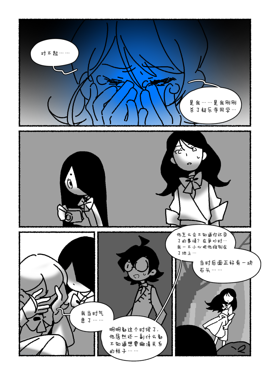 虽然是在说树蛙,但好多隐喻啊……第一次看到鱼子呕吐后仁科意味深长的眼神总感觉像想到了什么(但想到了什么呢,不过其然看到后面发现她已经推理出来了吧)树蛙透支生命往返为了延续后代,出现在这个场景里有点淡淡的悲哀。 第一起杀人案发生后悬疑的气氛变得好浓郁。 而幽幽浮现的ai说着顺水游到远方的事、太浪漫了…… 看到揭幕仁科完全是通过仔细的思考缜密的规划实实在在的赢了,太精彩了,但是又不失淡淡的悲伤。 现实的颜色是泛黑属于夜晚的,回忆的底色确实明亮的像上了天堂一样。 最后永别了亲爱的同学们……呜呜眼泪出来了……